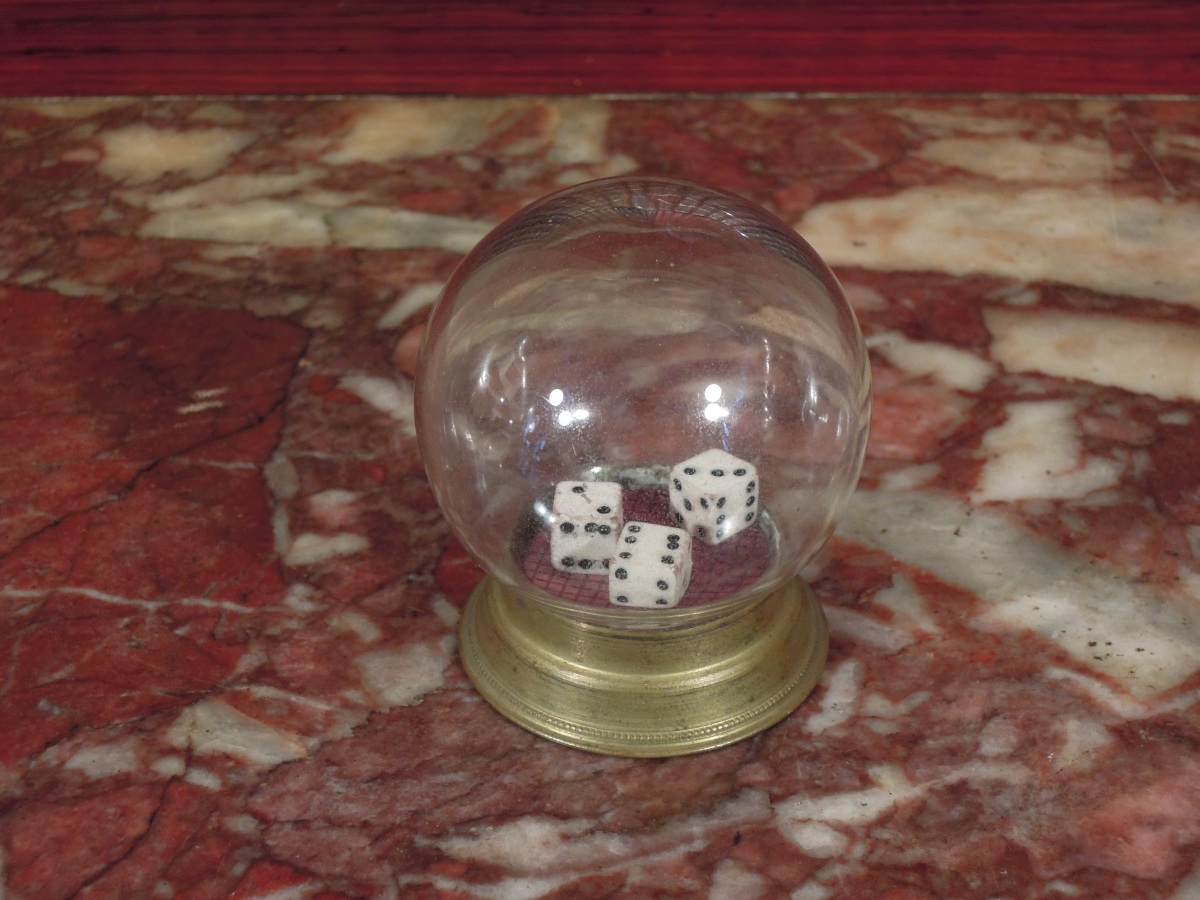 421. Trois DÉS dans une sphère de verre sur un socle en laiton. Fin XIXème.