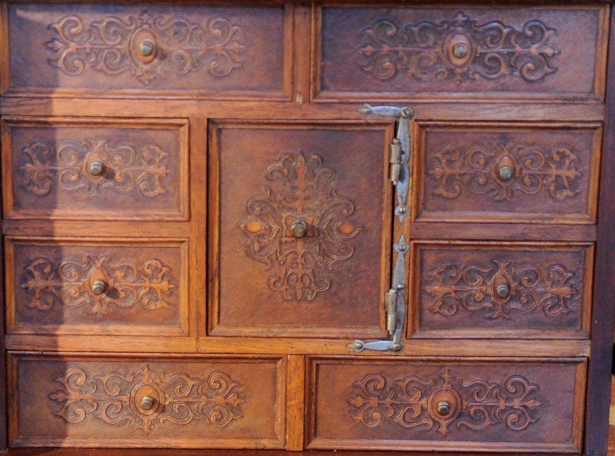 CABINET en bois à pentures et poignées de fer forgé de forme rectangulaire reposant sur quatre pieds toupies. Il ouvre en façade par deux vantaux découvrant sept tiroirs sur quatre rangs encadrant une porte centrale. Les tiroirs, la porte et l'intérieur des vantaux garnis d'un cuir gaufré de lambrequin, fleur-de-lys et arabesque.