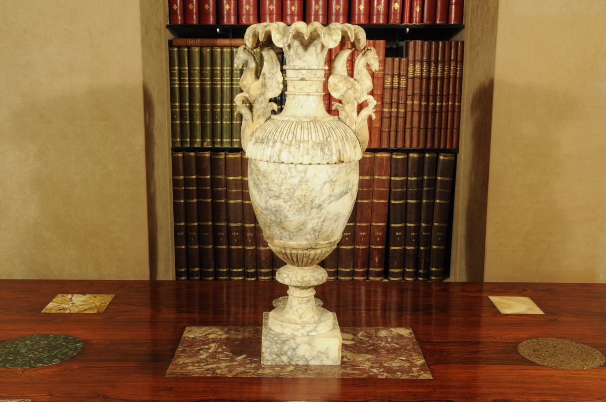 VASE AUX CHEVAUX AILÉS en marbre blanc veiné de gris. Sur un socle rectangulaire, le fut en ove godronné est surmonté d'un col évasé et mouvementé encadré par deux chevaux ailés. Seconde moitié du XIXème. Haut. 62 cm (l'aile droite d'un des chevaux accidentée).
