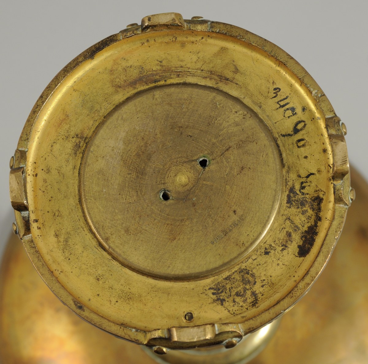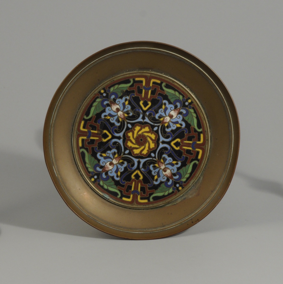 Fin XIXème. Haut. de la coupe : 18 cm. Haut. des flambeaux : 26 cm. (quelques petits manques d'émail)