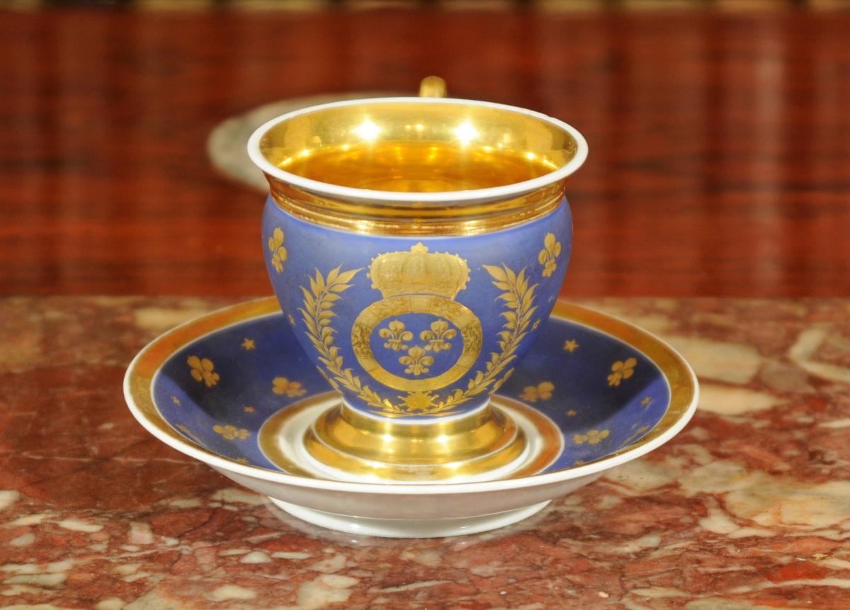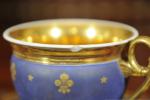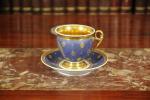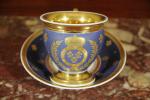TASSE et sa SOUS-TASSE en porcelaine à décor des armes de France à la feuille d'or sur fond bleu roi. L'intérieur et l'anse de la tasse décorés à l'or. La sous-coupe décorée d'un semi de fleur-de-lys étoilées sur fond bleu roi.