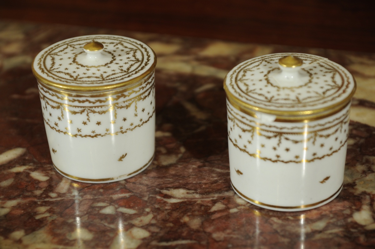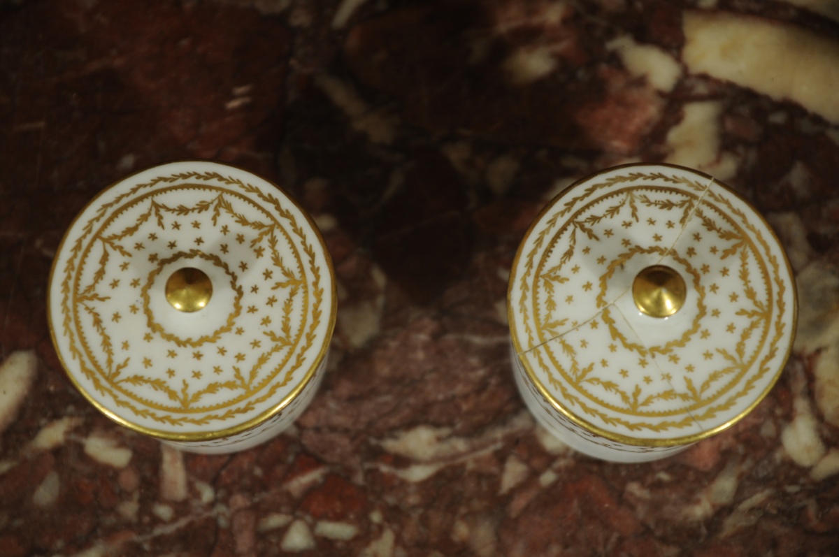 PARIS. Paire de POTS COUVERTS en porcelaine de forme cylindrique, décor or de guirlandes, feuillages, étoiles et filets. L'un marqué sous couverte PL entrelacé, l'autre d'une marque rouge. Début XIXème.