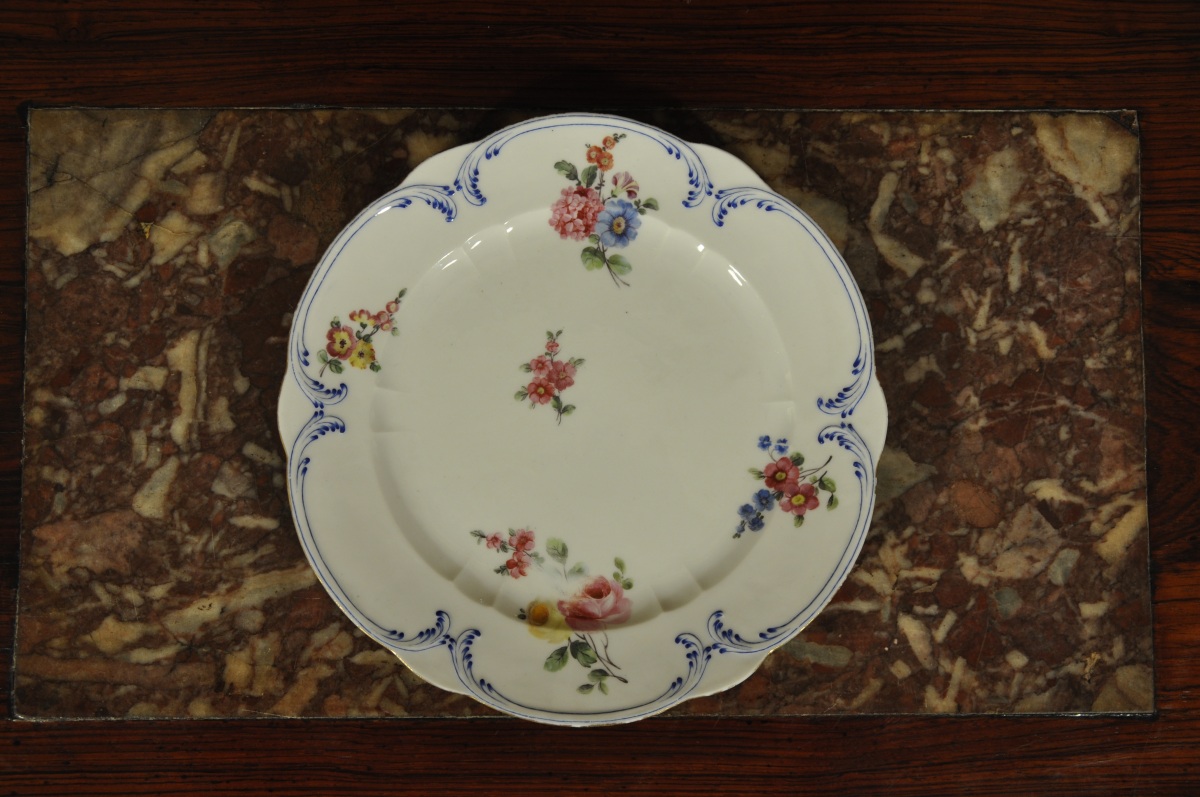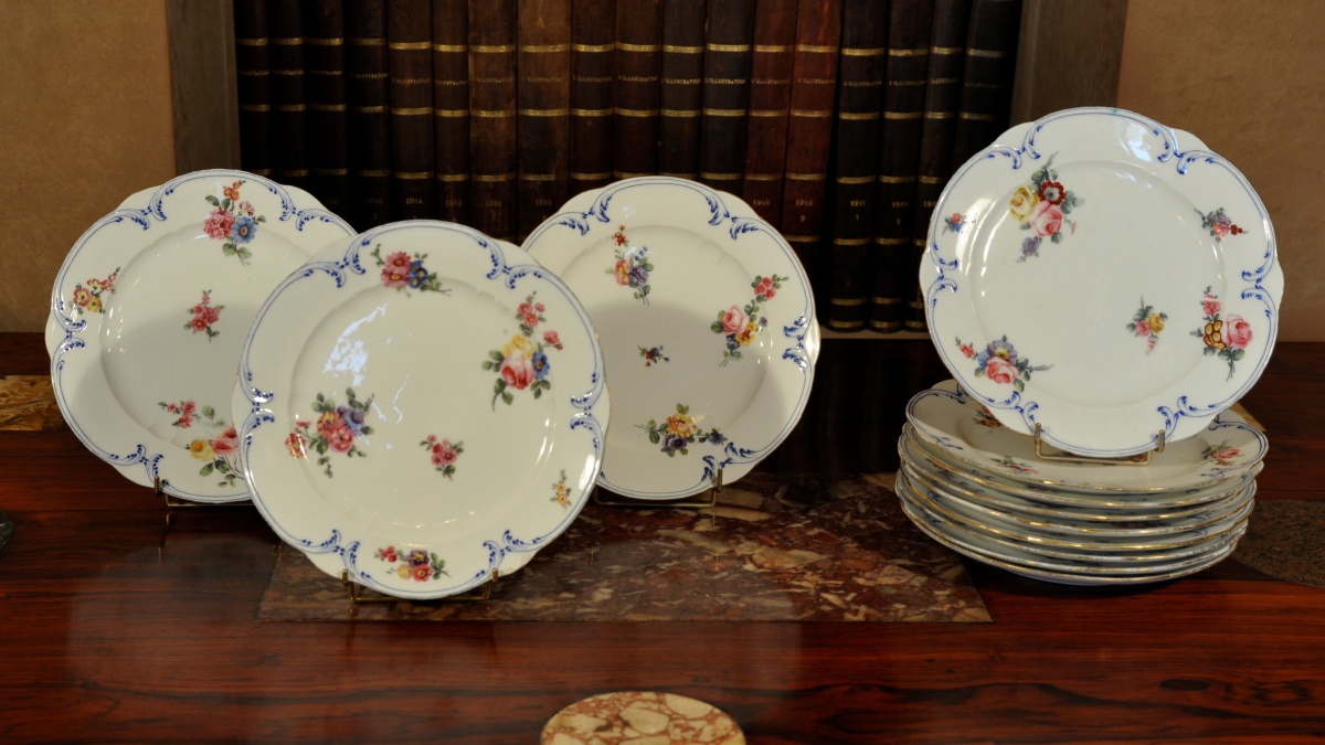 SÈVRES. Suite de 12 ASSIETTES. Décor polychrome en plein de jetés de fleurs. Rinceaux bleus et filet or sur le bord.
