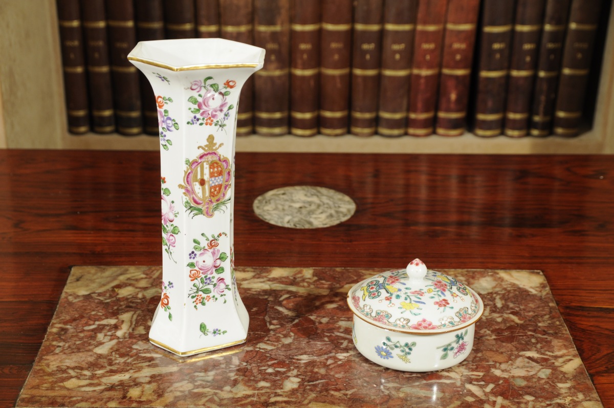 CHINE. COMPAGNIE DES INDES. VASE CORNET en porcelaine à décor polychrome armorié, de jeté de fleurs et liseré or. Marque rouge au revers.