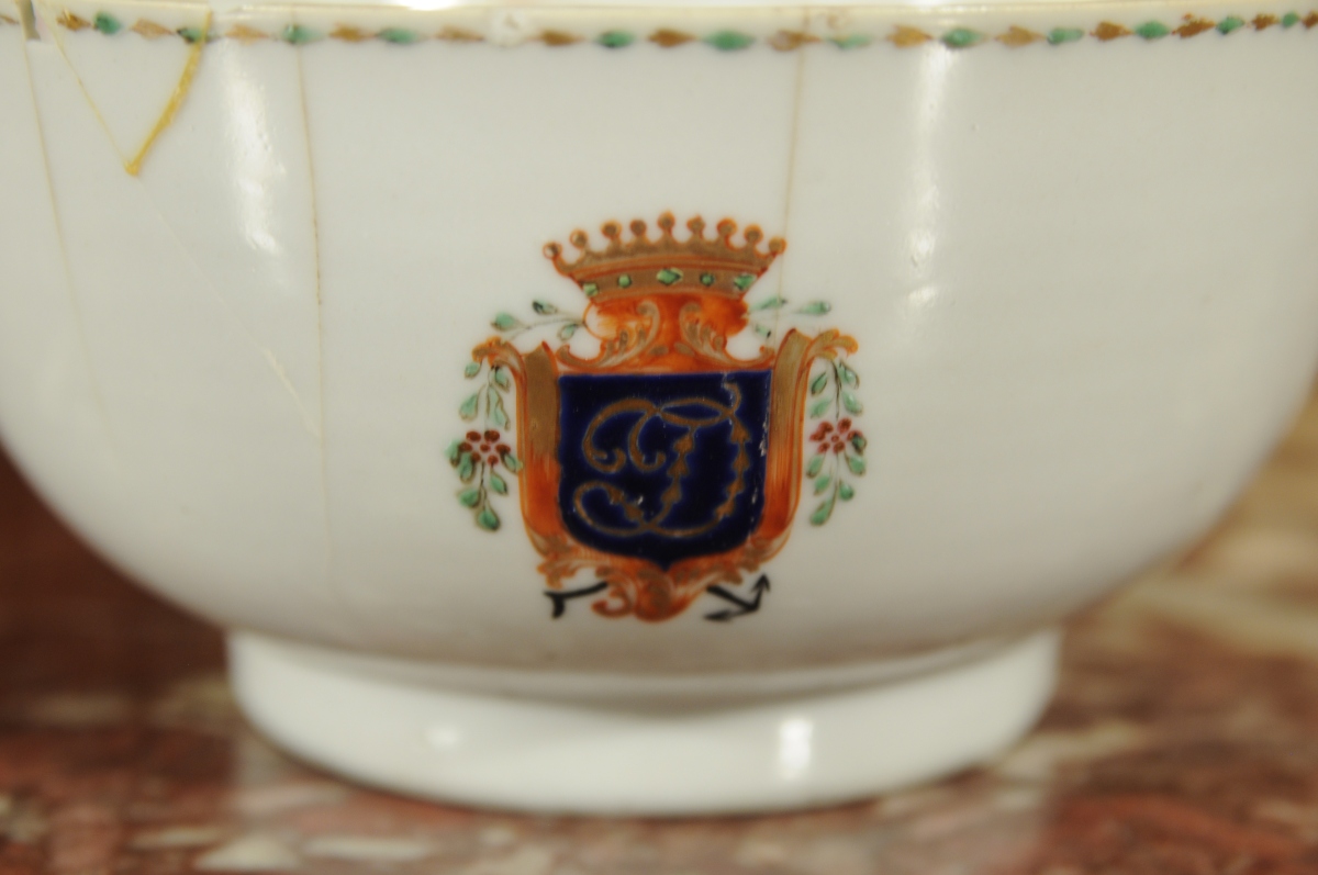 JATTE de forme circulaire en porcelaine à décor armorié sur fond blanc. Diam. 13,5 cm (accident, restauration).