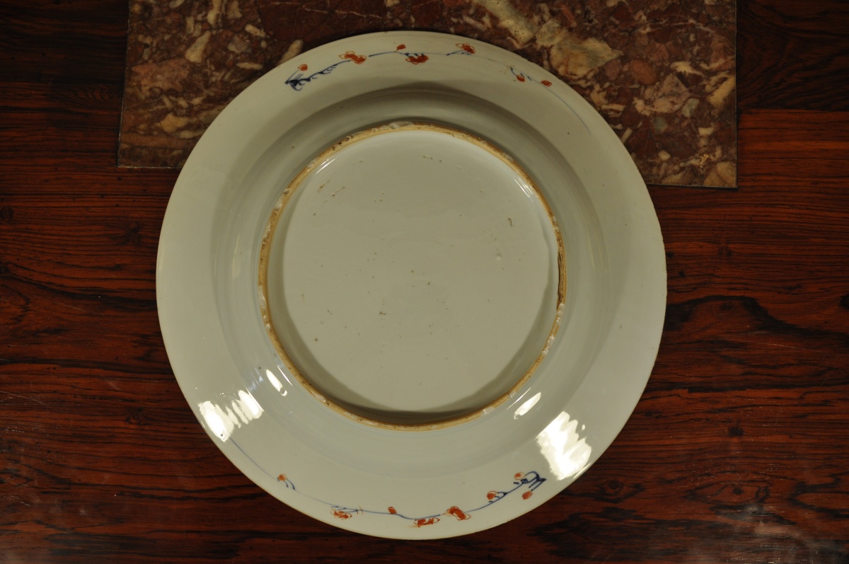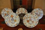CHINE. COMPAGNIE DES INDES. Suite de cinq grands PLATS en porcelaine à décor "Imari" bleu, rouge et or de larges fleurs et guirlandes fleuries.