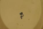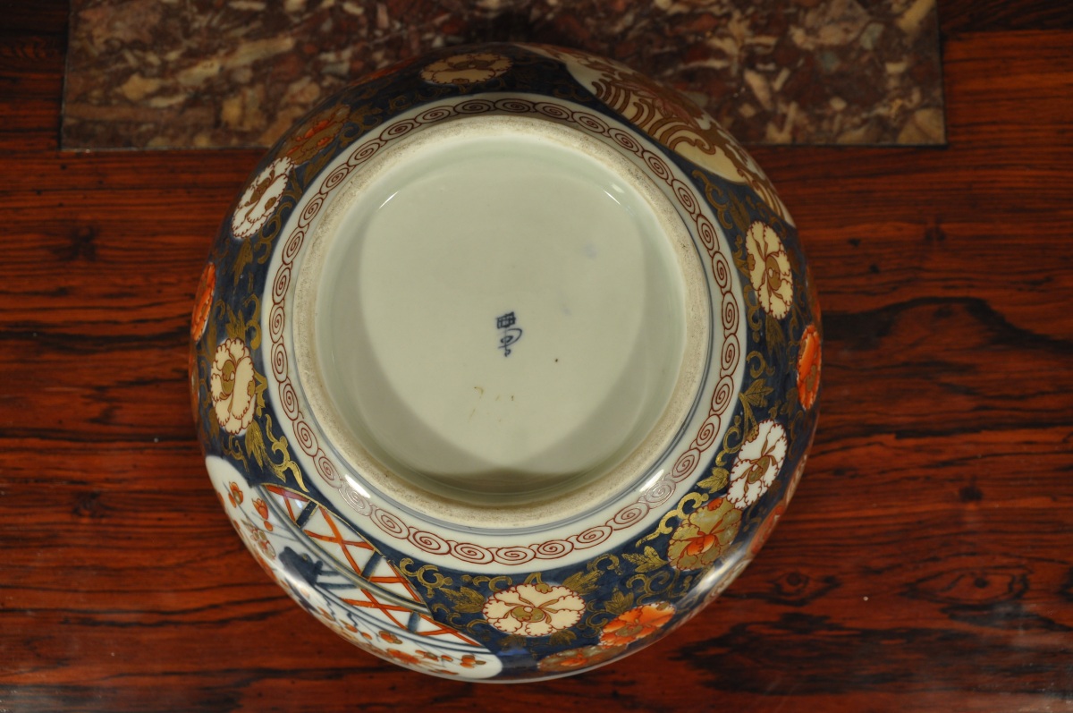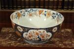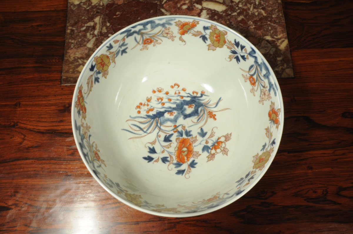CHINE. COMPAGNIE DES INDES. Grande JATTE en porcelaine à décor " Imari ", rouge, bleu et or de larges fleurs et guirlandes fleuries.