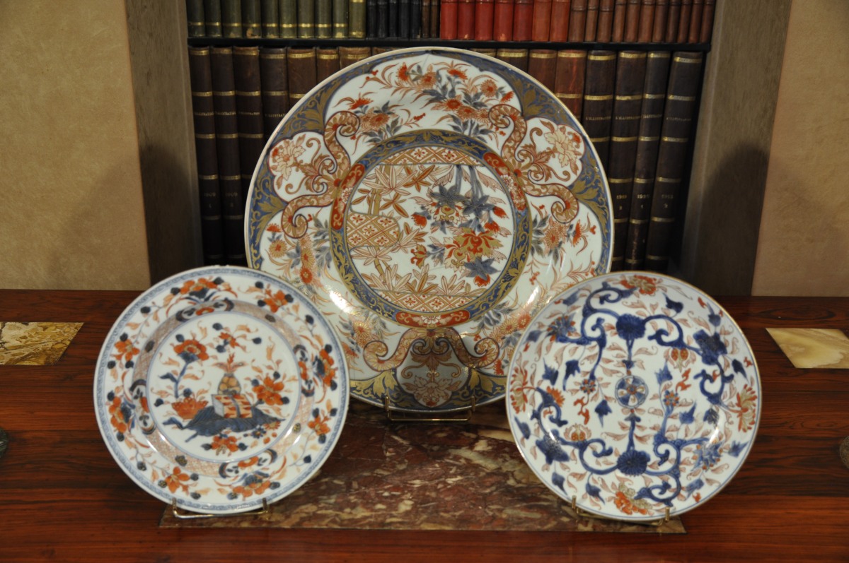 Joint : ASSIETTE PLATE et ASSIETTE CREUSE en porcelaine à décor " Imari " rouge, bleu et or. CHINE. COMPAGNIE DES INDES. XVIIIème.