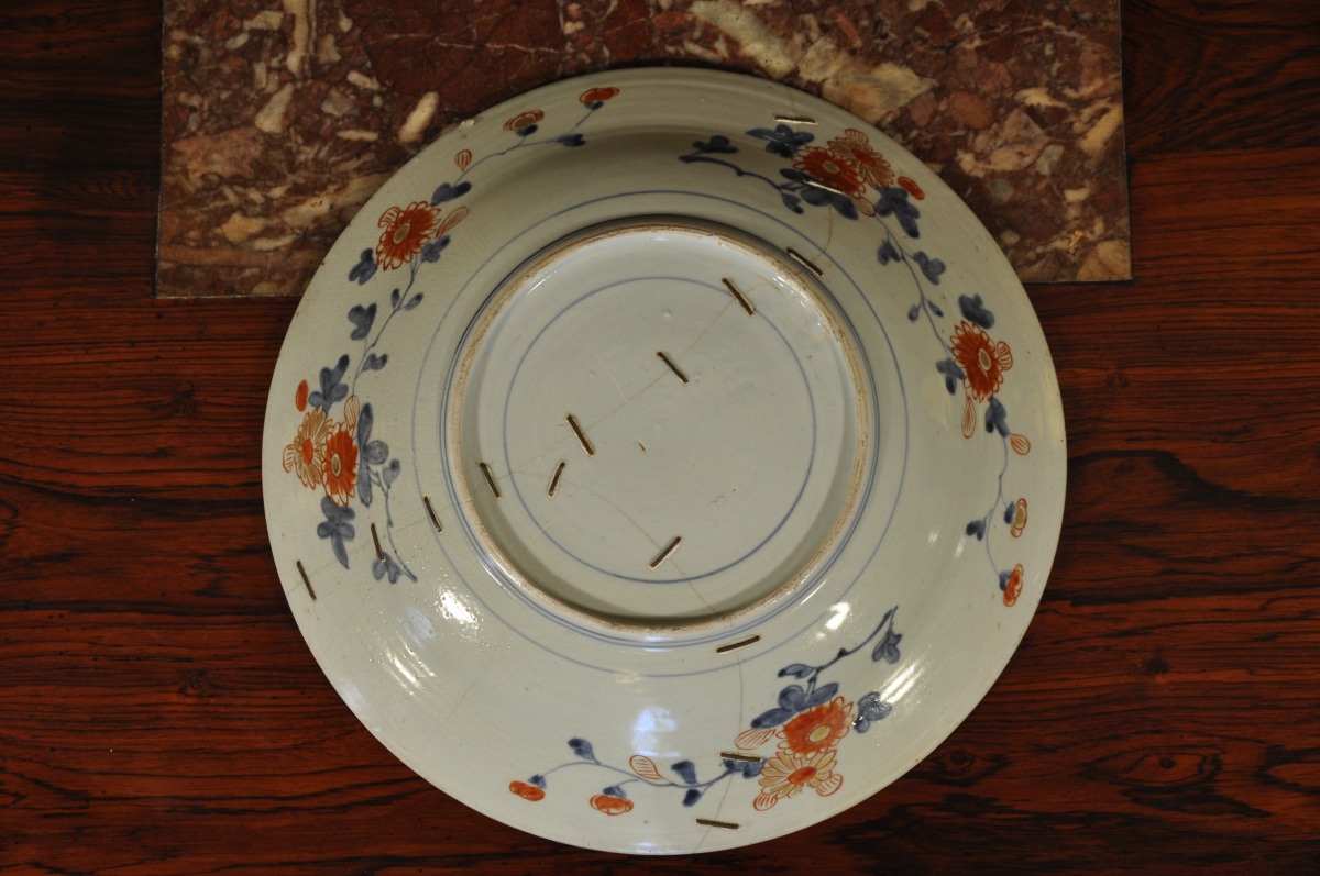 CHINE. COMPAGNIE DES INDES. Grand PLAT rond en porcelaine à décor " Imari " rouge, bleu et or de larges fleurs épanouies et guirlandes fleuries.