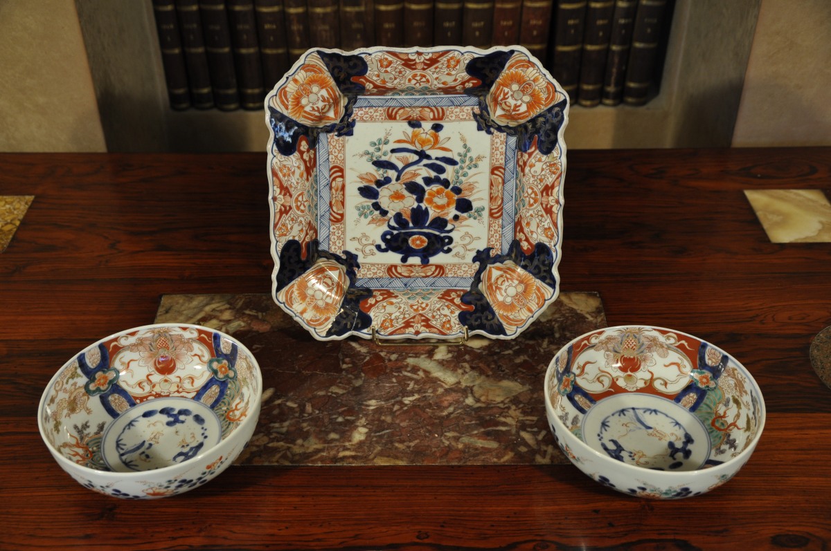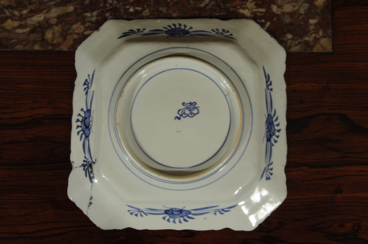 Joint : PLAT de forme rectangulaire à pans coupés en porcelaine à décor " Imari " rouge, bleu et or. De fleurs dans des réserves. CHINE. COMPAGNIE DES INDES. XVIIIème. 28,5 x 28,5 cm.