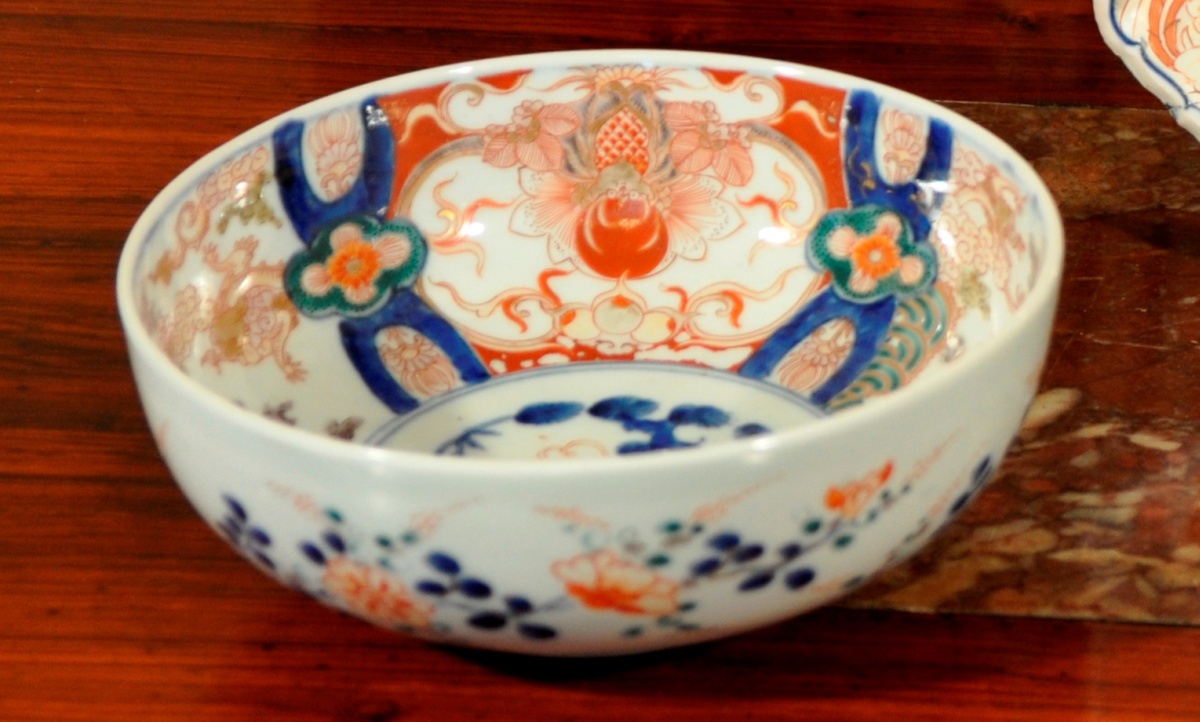 CHINE. COMPAGNIE DES INDES. Paire de COUPE de forme ronde en porcelaine à décor " Imari " rouge, bleu et or de dragons dans des réserves fleuries.