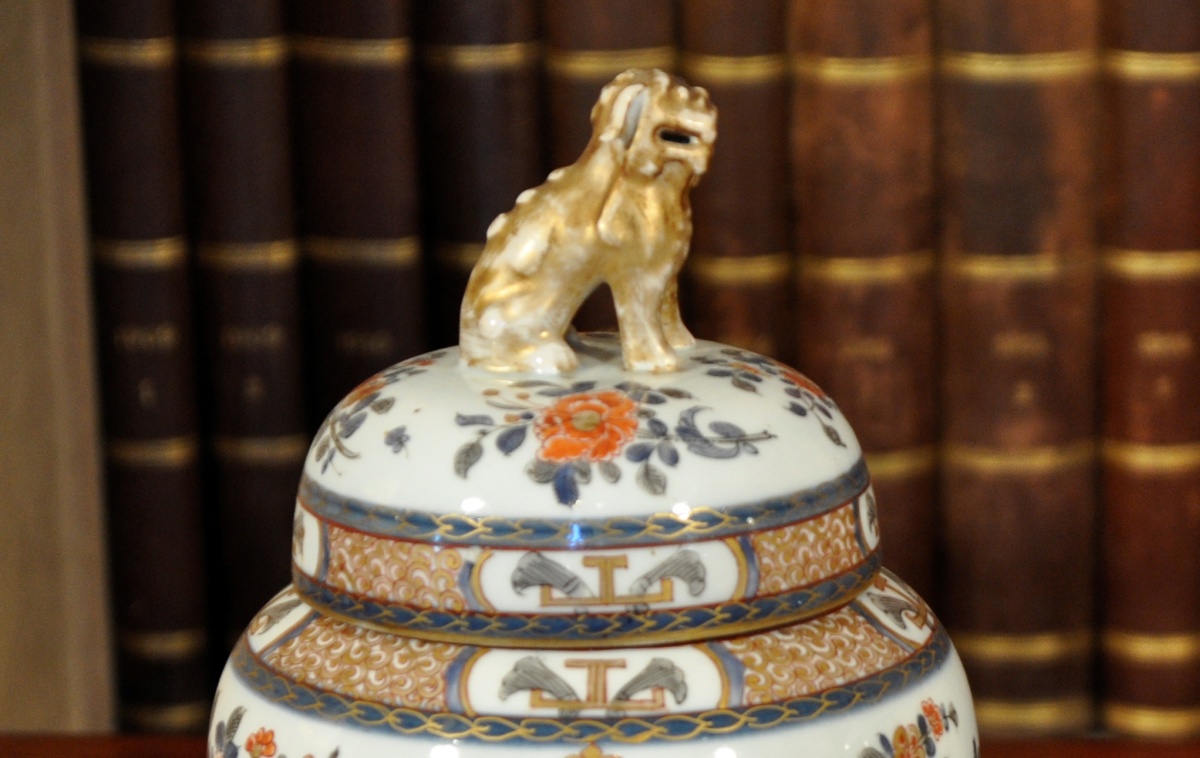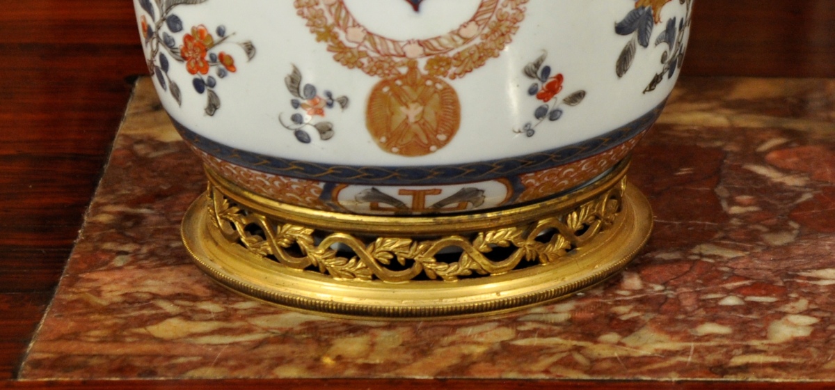 CHINE. COMPAGNIE DES INDES. Paire de POTS COUVERTS AUX ARMES DE France surmonté d'un chien de Fô en porcelaine à décor " Imari " rouge, bleu et or aux Armes de France, jetées de fleurs et frises géométrique. MONTURE européenne en bronze dorée à décor ajouré d'une guirlande de lauriers. XVIIIème. Haut. Totale 29 cm.