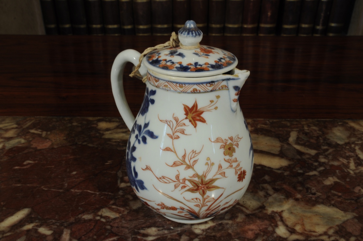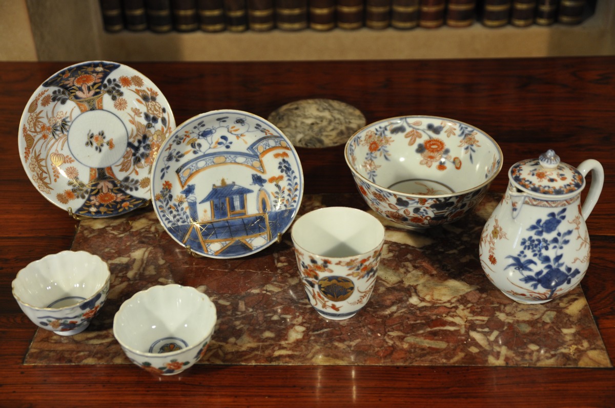 CHINE. COMPAGNIE DES INDES. Ensemble en porcelaine à décor " Imari " rouge, bleu, or à motif floral comprenant : une TIMBALE, une VERSEUSE, une paire de COUPES godronnées, une JATTE et deux petites ASSIETTES. XVIIIème.