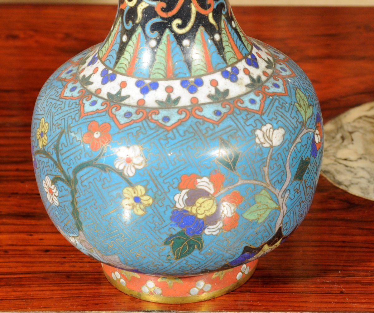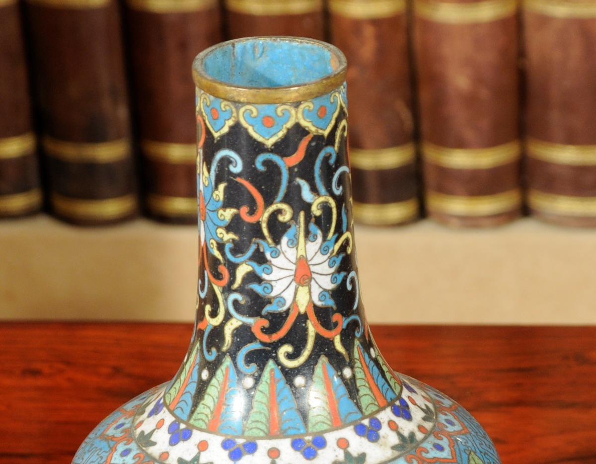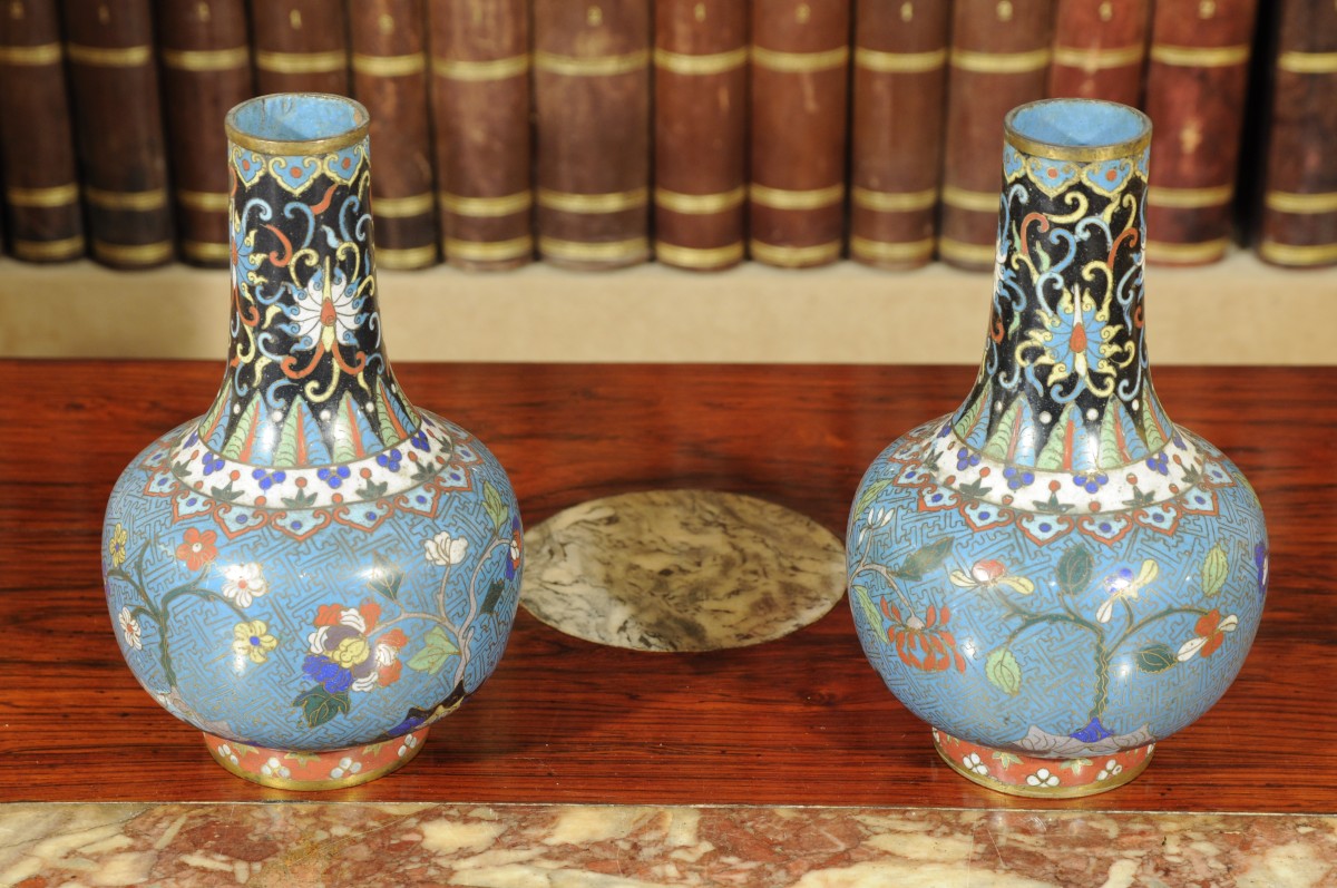 CHINE. Paire de BOUTEILLES en bronze à décor d'émaux polychromes à motifs floraux. XVIIIème - XIXème. Haut.20,2 cm.