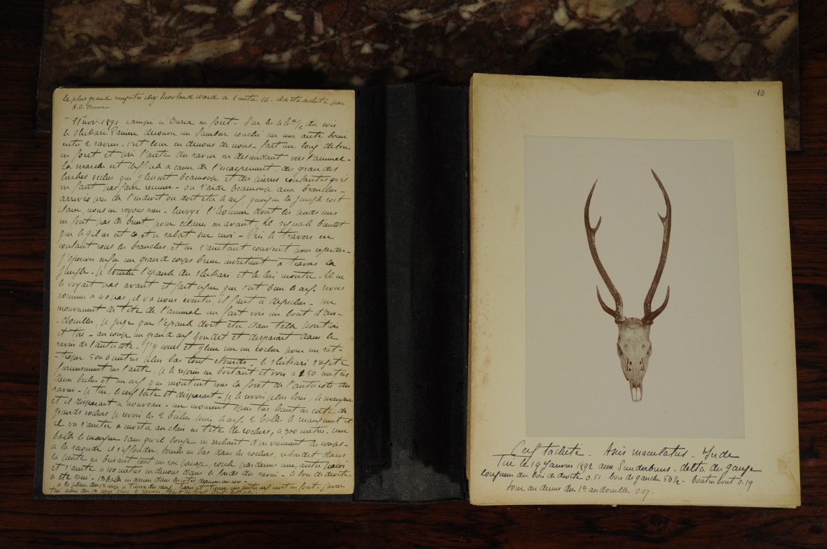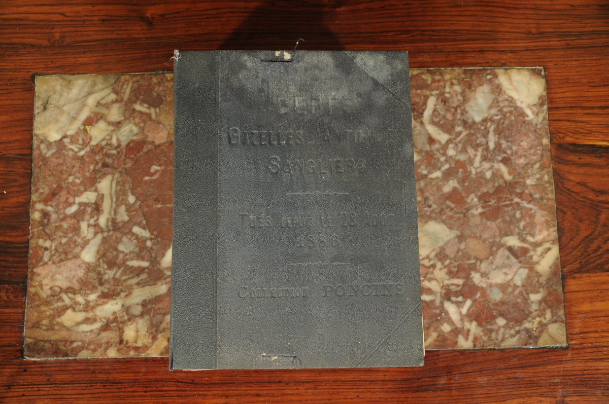 Chaque sujet fait l'objet d'un commentaire manuscrit à l'encre sur le support de montage et/ou au dos. Chaque description précise l'espèce de l'animal, le lieu et la date où il a été tué, les dimensions du trophée et d'abondants récits des conditions de la chasse. Edmond de Poncins cite quelquefois les noms d'autres chasseurs comme "l'américain Thériat, le lieutenant-colonel Cust, le duc de Saxe Cobourg et Gotha, le comte Arco, le Maharadja Sindhia