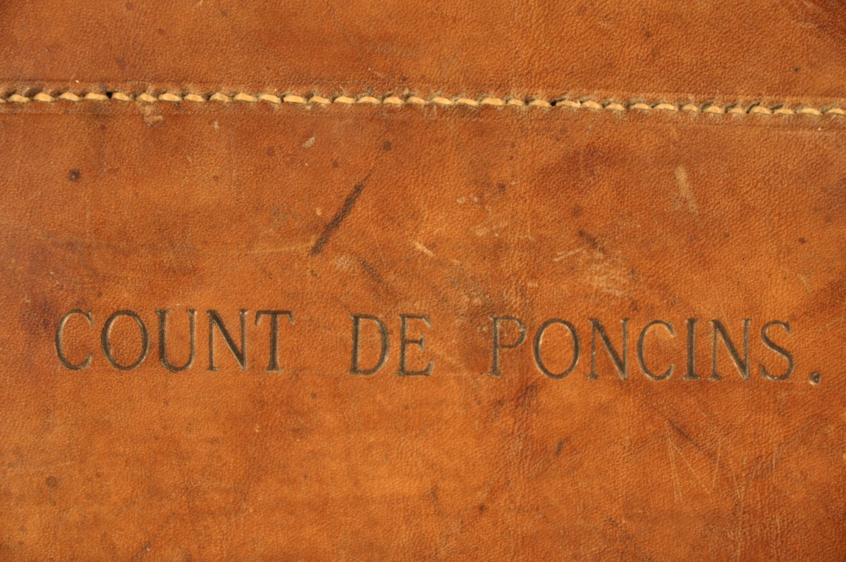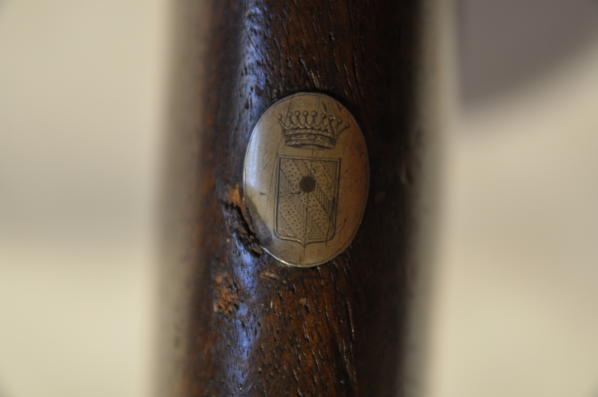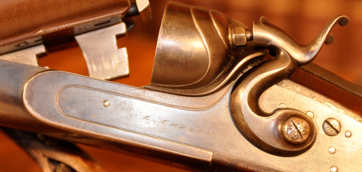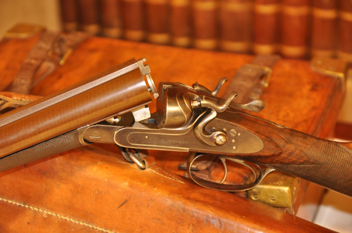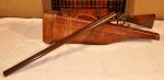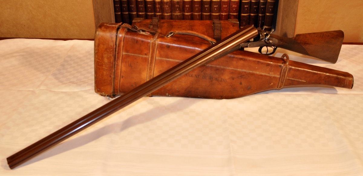 FUSIL DE CHASSE à percussion centrale, chiens extérieurs, deux coups, calibre 12-75 (18). Canons damas juxtaposés de 76,5 cm de Didier Drevet. Platines gravées " L. Chalet à Saint Etienne ". Crosse en noyer quadrillé, marquée sur une pièce de laiton aux armes couronnées de Poncins.