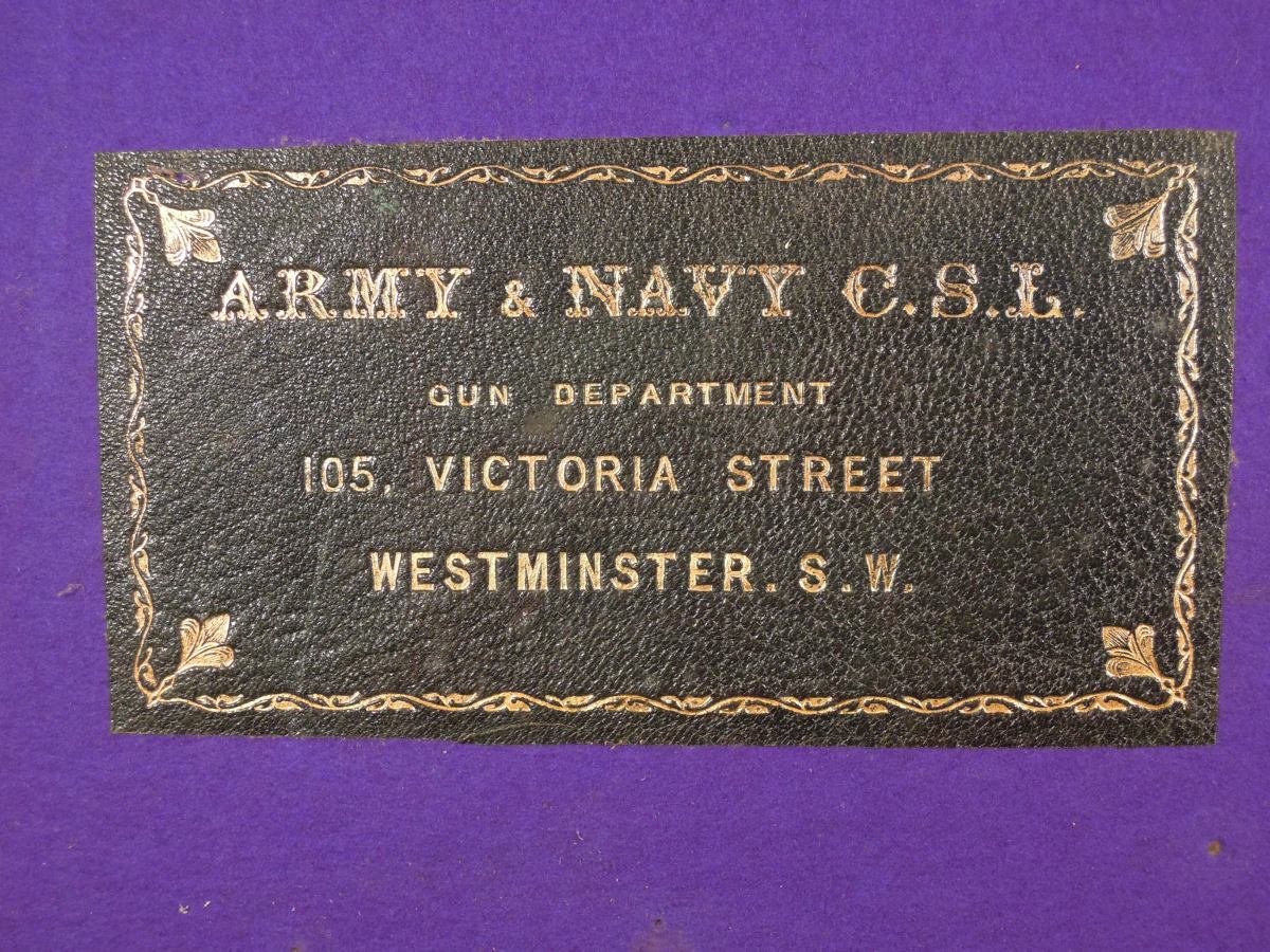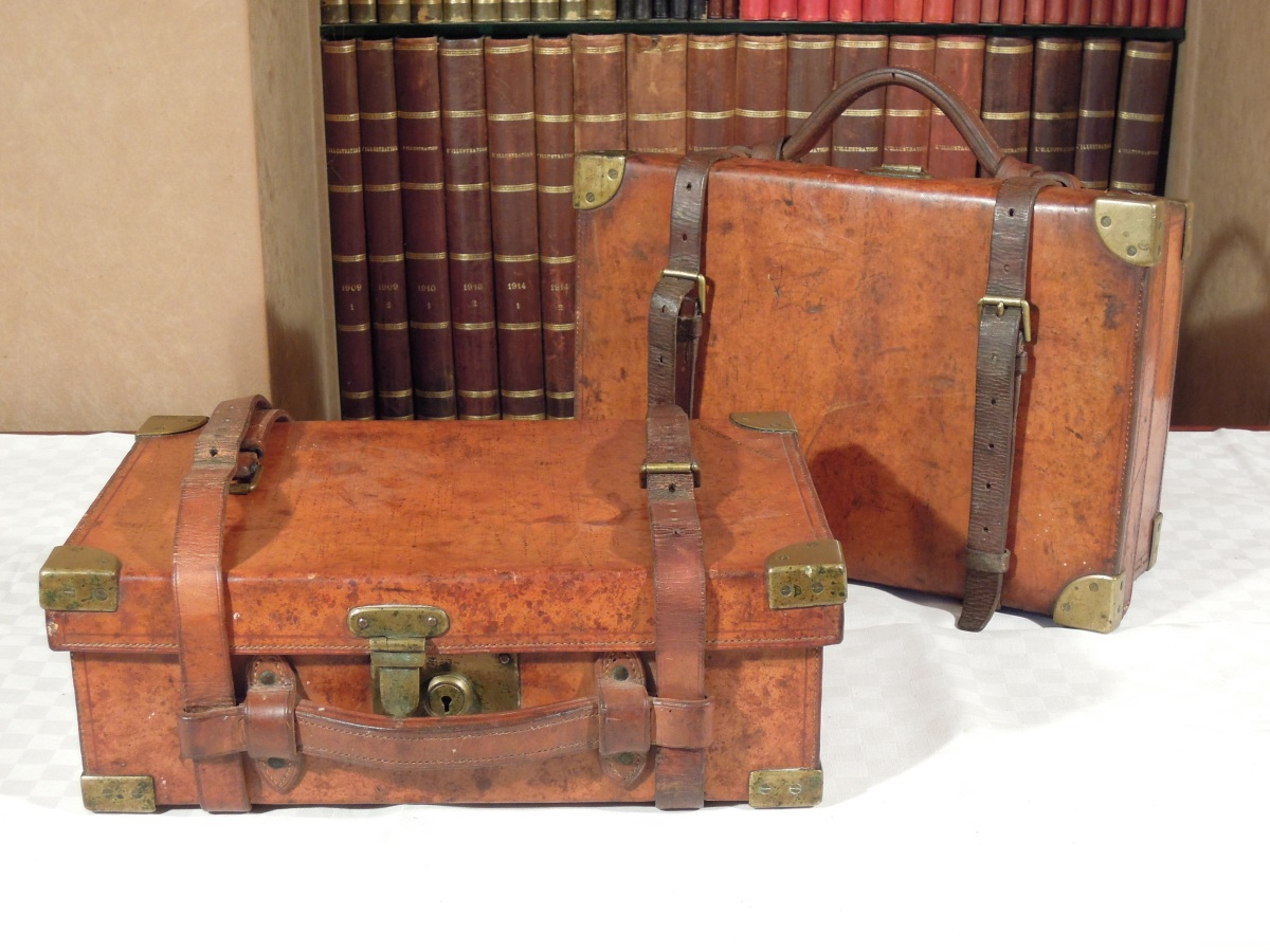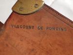 Paire de CARTOUCHIÈRES en cuir marquées " Viscount de Poncins ", coins et serrure en laiton, étiquette en cuir rouge gauffré à l'or : " Army & Navy C.S.L. Gun department 105, Victoria street Westminster S.W ".