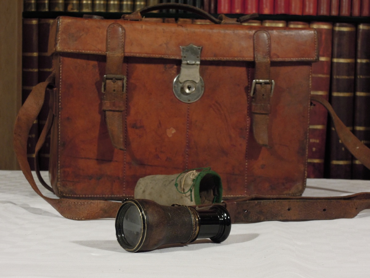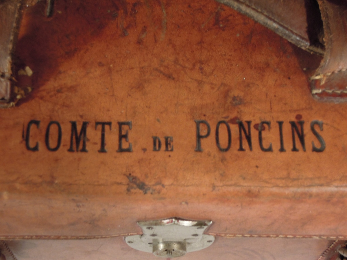 Joint : CARTOUCHIÈRE en cuir marquée " Comte de Poncins ". Haut. 24, Larg.36, Prof. 14 cm. (accidents)