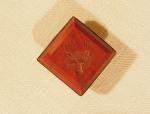 BOUTON ET BROCHE de forme carrée en pierre rouge gravée d'une tête de renard " TALLY HO " dans une monture en laiton. Long. 2,2 cm.