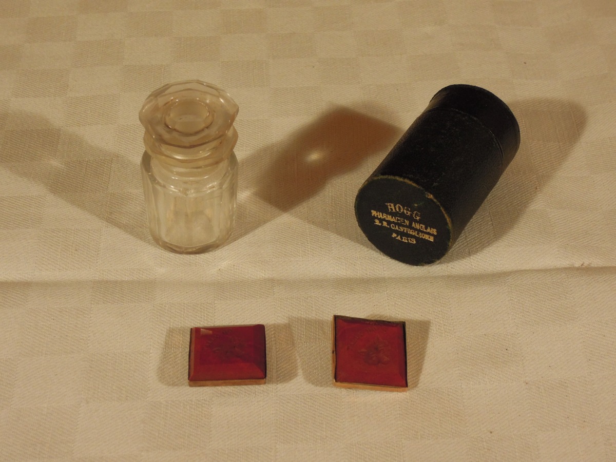 Joint : FLACON en verre dans un étui cylindrique gainé de en cuir marqué " HOGG Pharmacien anglais 2, R. Castiglione Paris ".