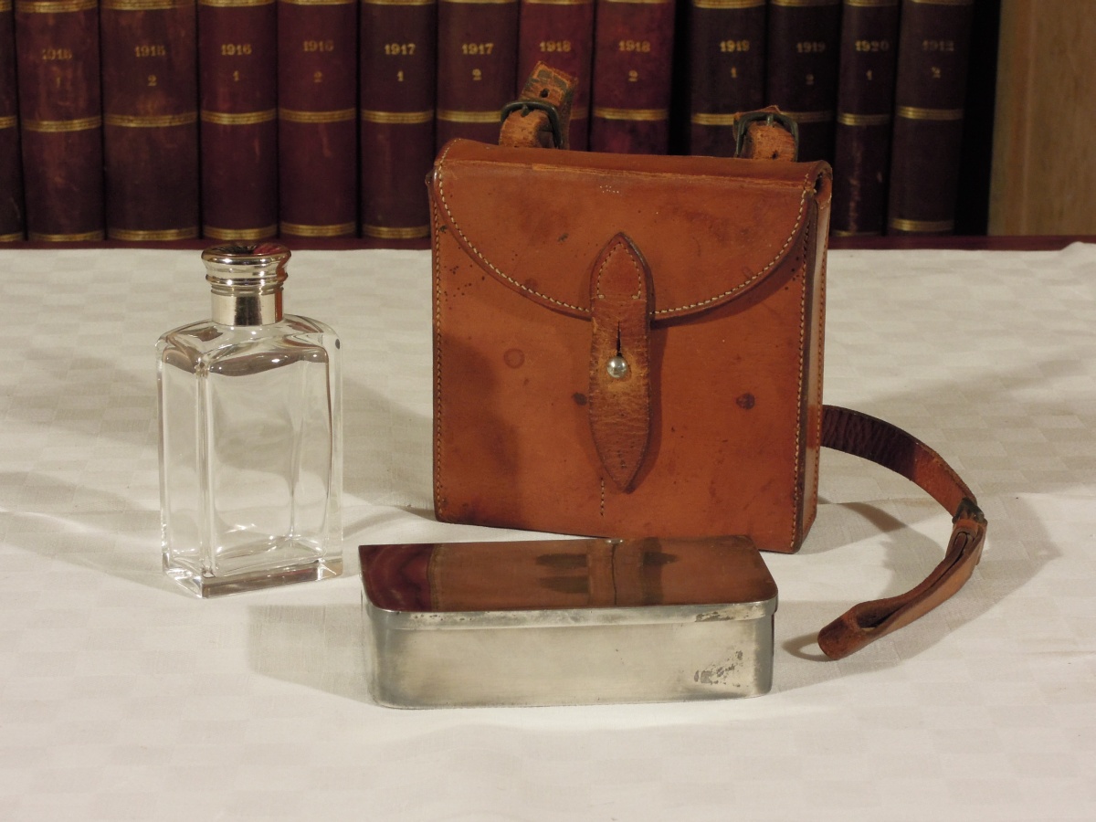 PIC-NIC DE CHASSE dans un étui en cuir fauve à bretelles comprenant une flasque et une boite en métal argenté et verre.