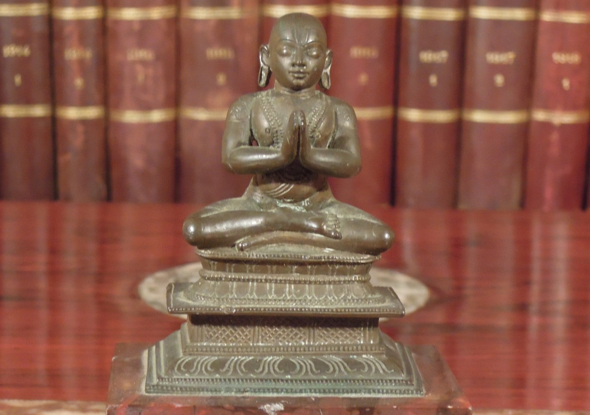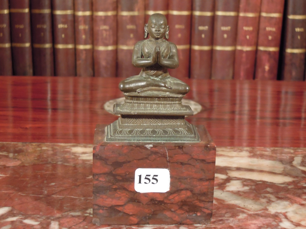 PERSONNAGE PRIANT en bronze sur un socle de marbre rouge. Haut. totale : 13,3 cm.