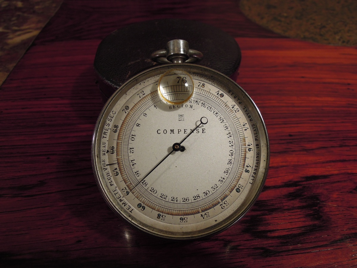 BAROMÈTRE HECTOM en métal argenté, dans un étui gainé de cuir bordeaux, le cadran en acier signé " Lafontaine 18, Palais Royal Paris ". Fin XIXème-Début XXème ".