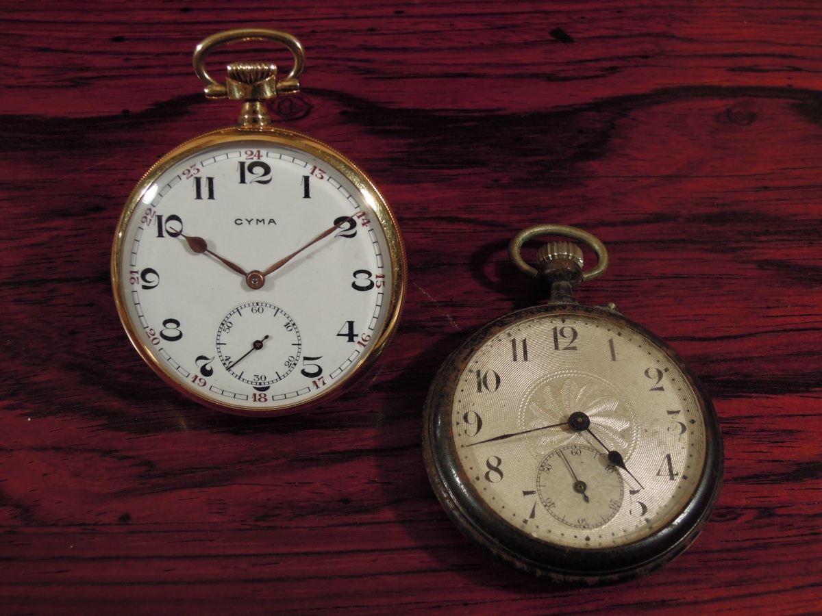 DEUX MONTRES GOUSSET à remontoir à double cadran en chiffres arabes indiquant les heures et les secondes, l'une en métal plaqué or de marque CYMA, l'autre en métal argenté à décor niellé. Début XXème.