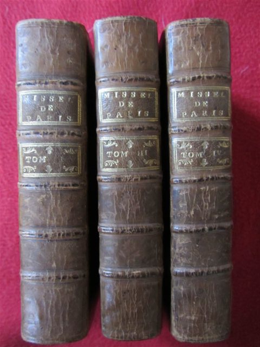 Missel de Paris imprimé par ordre de Monseigneur l'Archevêque de Paris. Paris, Les librairies associées pour les usages du diocèse, 1738. Trois volumes in-12 d'environ 530 pages (manque le vol II). Ex-libris : Comte de Montmorency-Luxembourg, Comte de Poncins. Reliure en plein veau, le dos nervuré. Incomplet.