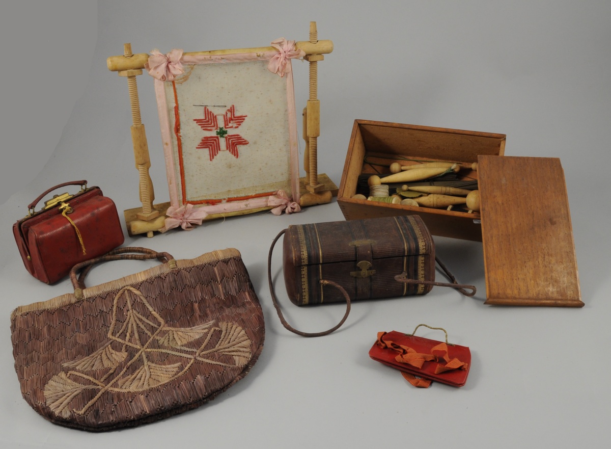 - CADRE réglable pour ouvrage au point de croix en bois naturel et son ensemble de bobines, navettes et aiguilles.
