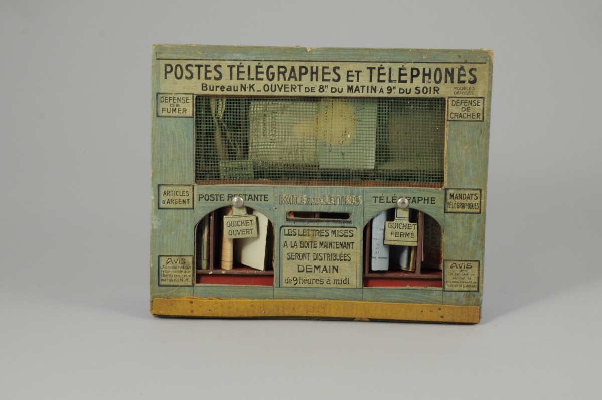 N.K FRANCE. POSTE ENFANTINE dans une boîte en pin et cartonnage, façade simulant un guichet de poste, petits casiers à l'intérieur avec ensemble d'environ 70 fausses cartes postales, timbres, mandats et autres documents postaux. Début XXème. Haut. 23, Larg. 28, Prof. 5 cm. (usures d'usages)