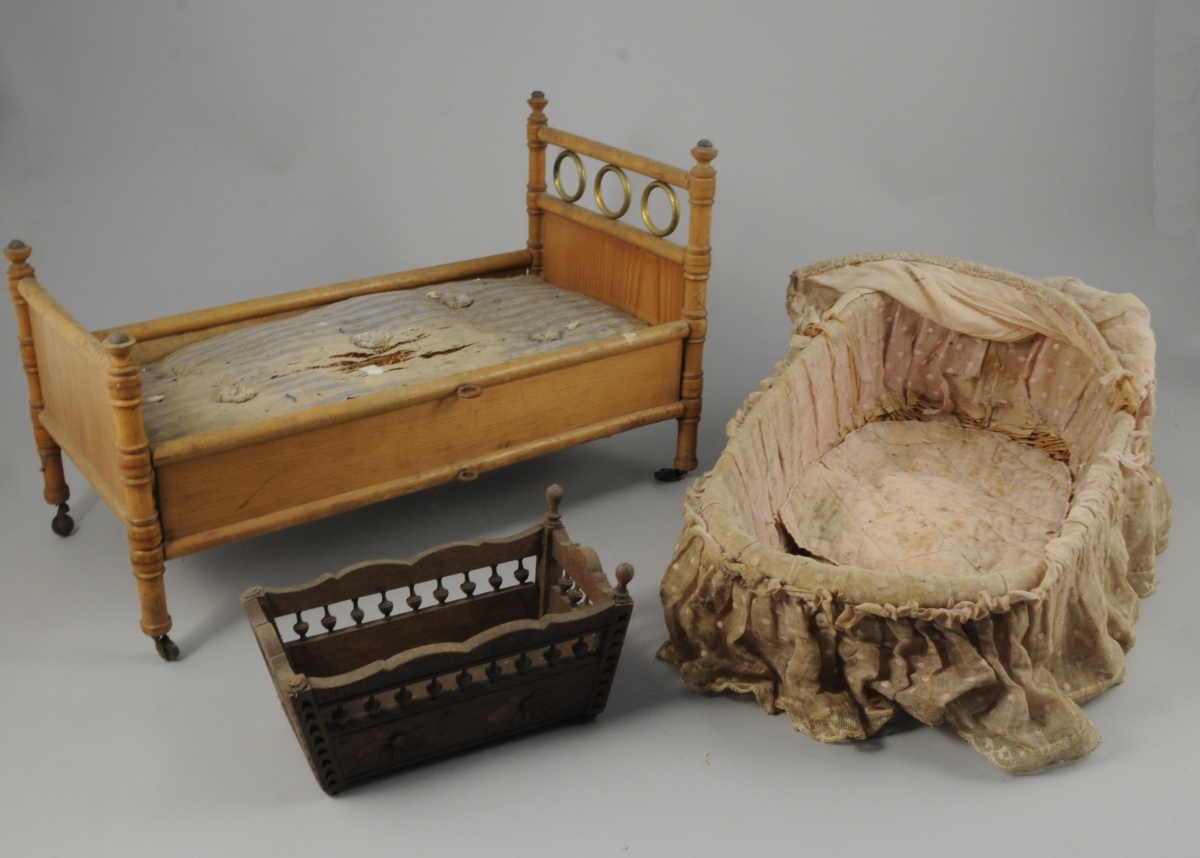 JOINT : COUFFIN en osier recouvert d'une dentelle à pois et BERCEAU en bois tourné et sculpté. Début XXème.