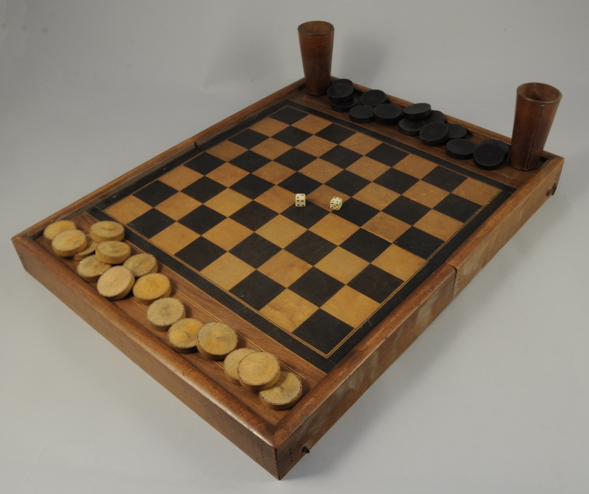 JEU de BAGGAMON combiné à un JEU de DAMES en bois naturel et bois teinté, godets en cuir. Début XXème. Long. 43, Larg. 27 cm. (usures, un jeton rapporté)