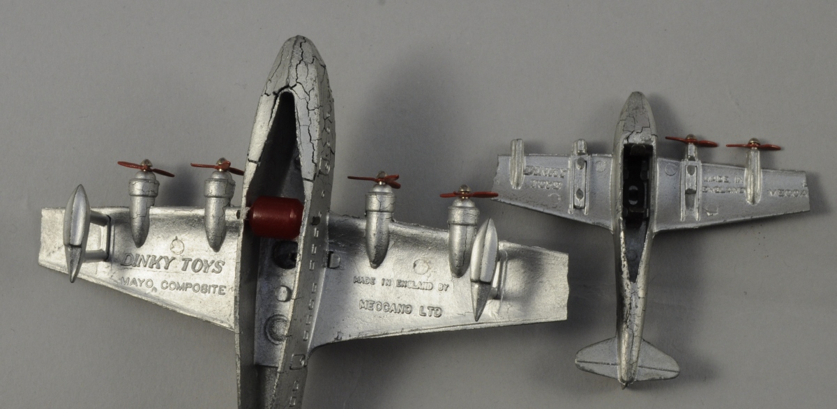DINKY TOYS. MAYO Composite, réf. 63, argent. Sans boîte. (quatre ailes cassées, manque deux hélices et deux patins)