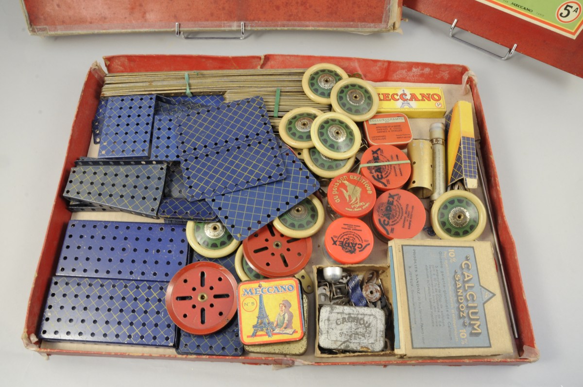 MECCANO France. Boîte N°5 avec ensemble de pièces dont roues, poulies, plaques, cornières. Milieu du XXème. (accidents au cartonnage)