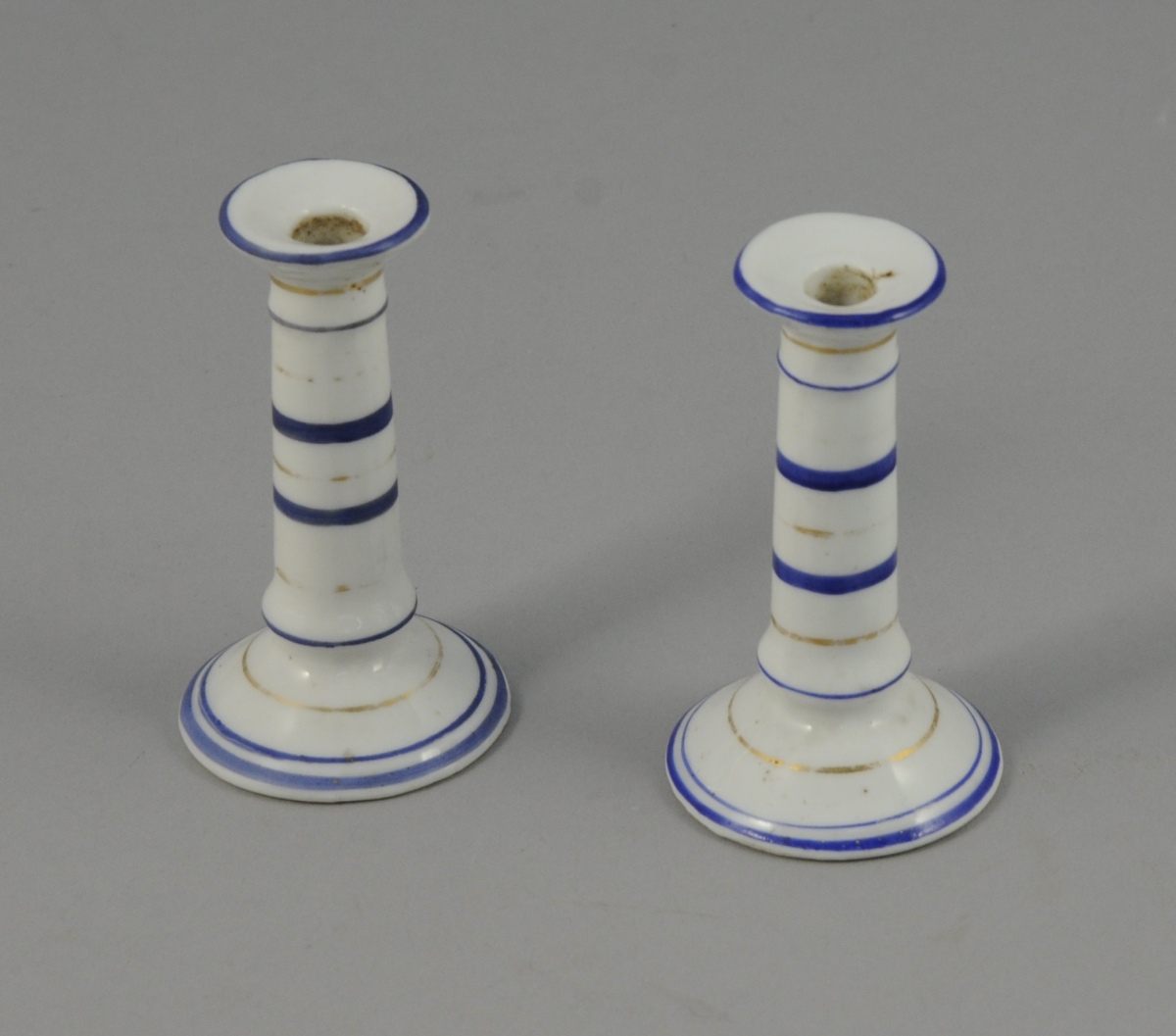 PAIRE de BOUGEOIRS de poupée. Décor de filets bleus et or. XXème. Haut. 8,8 cm. (usures à l'or)