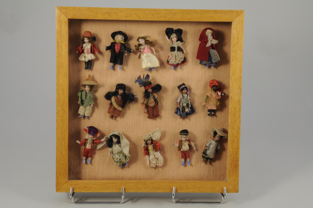 15 POUPEES miniatures en biscuit, bouche et yeux peints, cheveux naturels. Elles sont vêtues de costumes traditionnels de divers pays tels que Russie, Espagne, Amérique Latine et Extrême-Orient. Dans une vitrine. Fin XIXème. Haut. moyenne 6 cm. Vitrine : 32 x 32 cm. (légères usures)