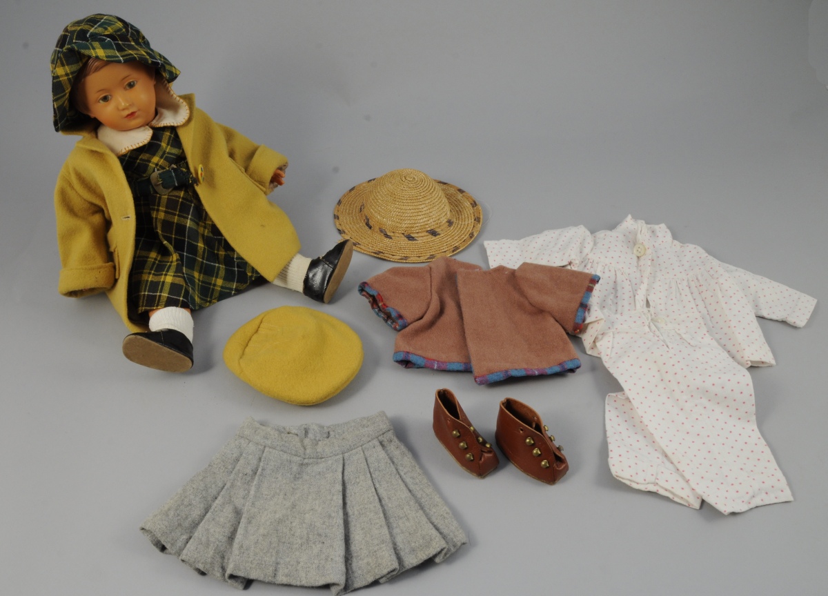 POUPÉE, tête et corps en celluloïd, yeux fixes, cheveux châtains moulés, tête et membres articulés. Vêtue d'une robe écossaise verte avec capeline assortie, manteau trois quarts moutarde, chaussettes blanches et chaussures en cuir noir. Marquée S.N.F France 39. Milieu du XXème. Haut. 40 cm.