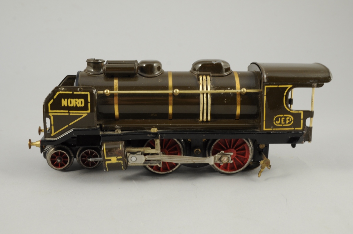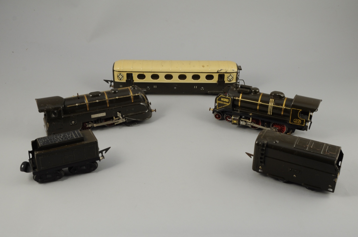 JEP. LOT comprenant deux locomotives à moteurs S52 et S59, deux tenders et une voiture, en métal laqué. Long. de la voiture 37 cm. (légères usures)