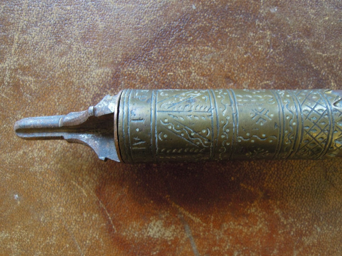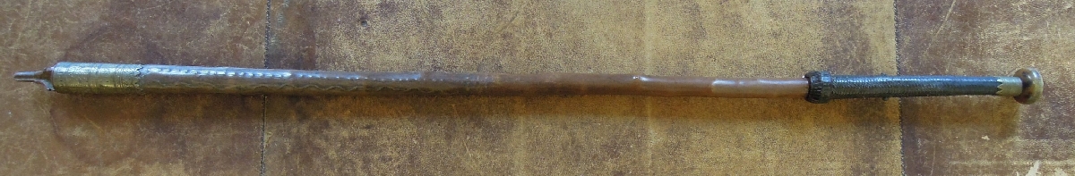 MAKILA en corne, bois, laiton, cuir et fer, poignée dévissable datée 1895 et gravée sur la bouttrreolle "J. AINCIART. LARRESSORE. B-P". Long. 93 cm.