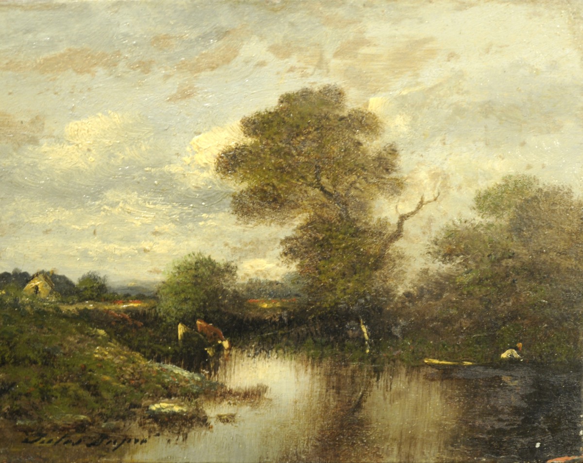 Jules DUPRÉ (Nantes 1811 - L'Isle-Adam 1889)Vaches à l'abreuvoir.Panneau, une...