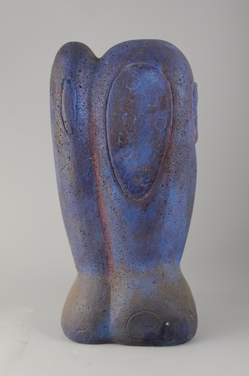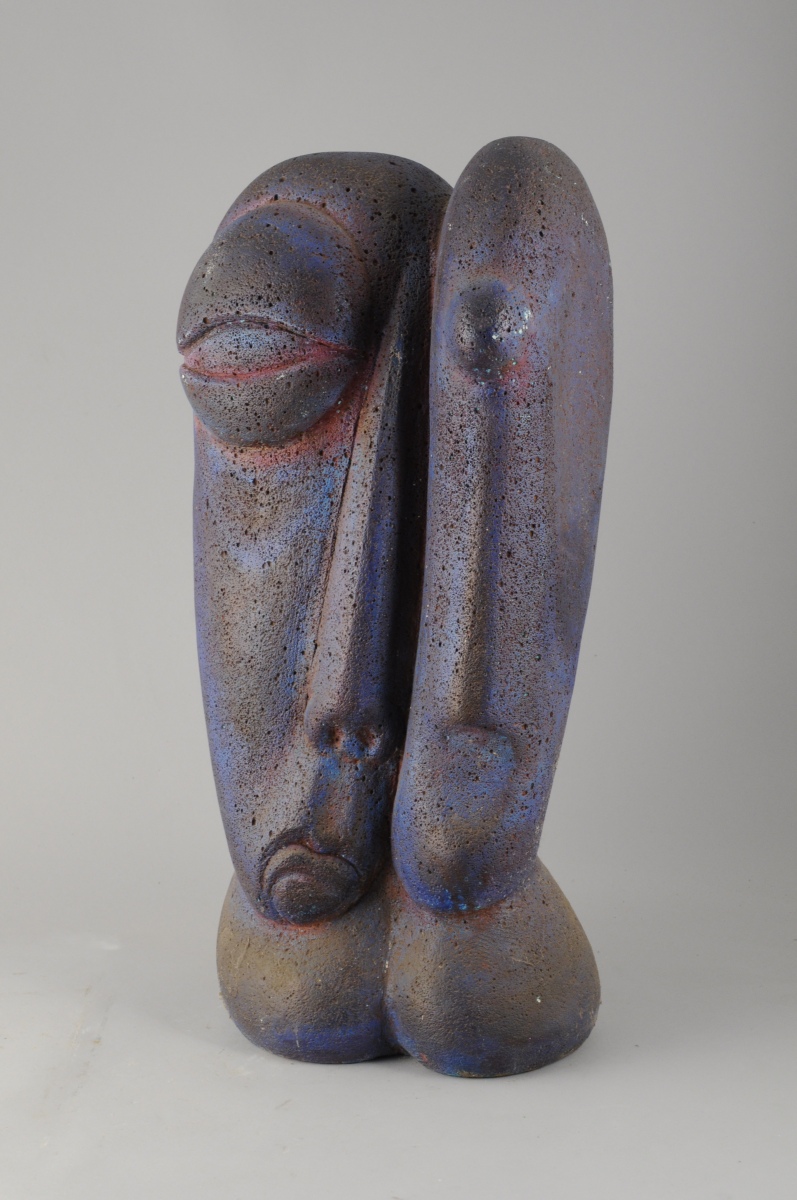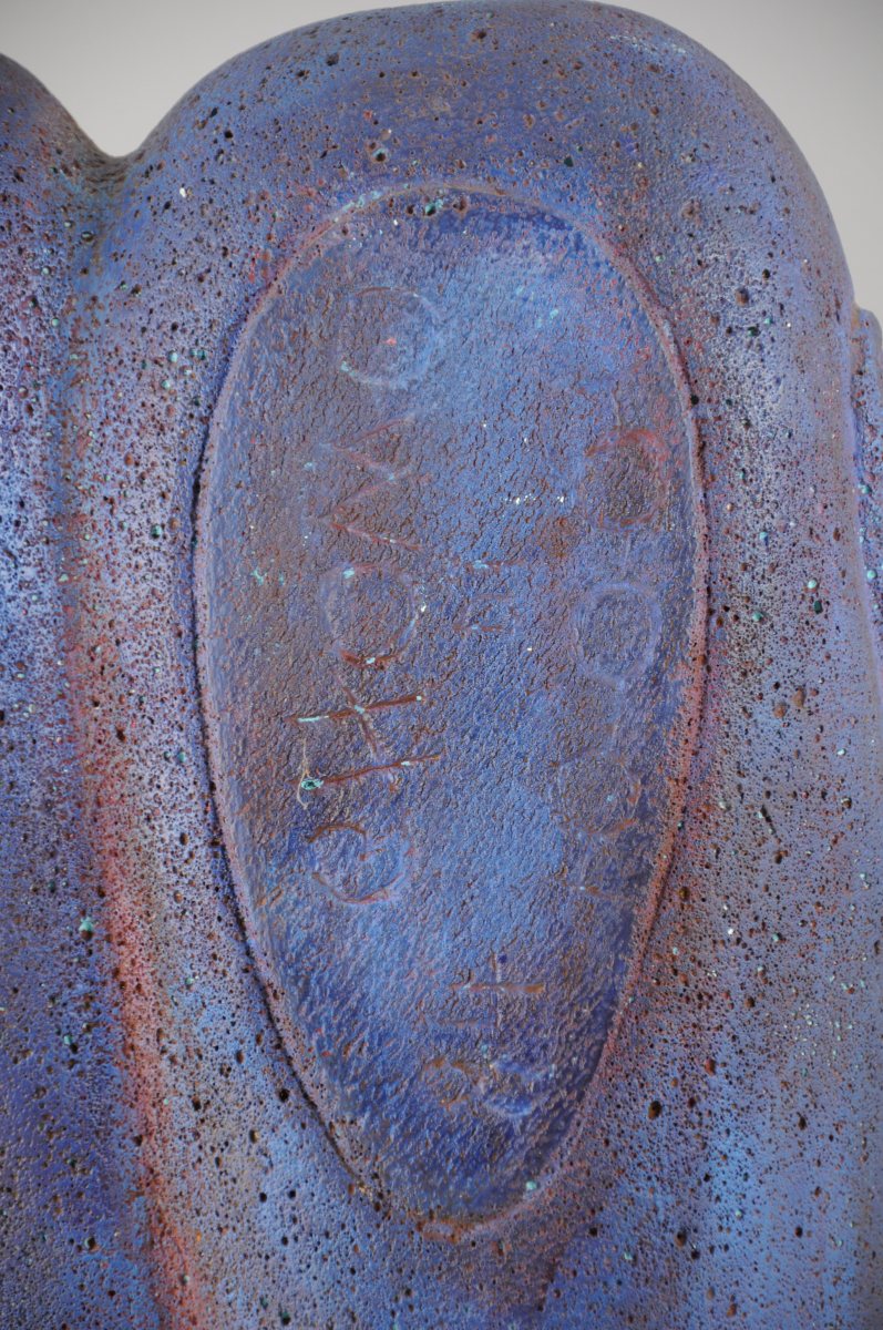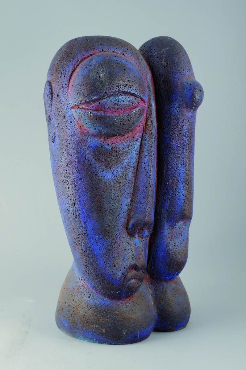 Sculpture en siporex à pâtine noire, rouge et bleue, signée.