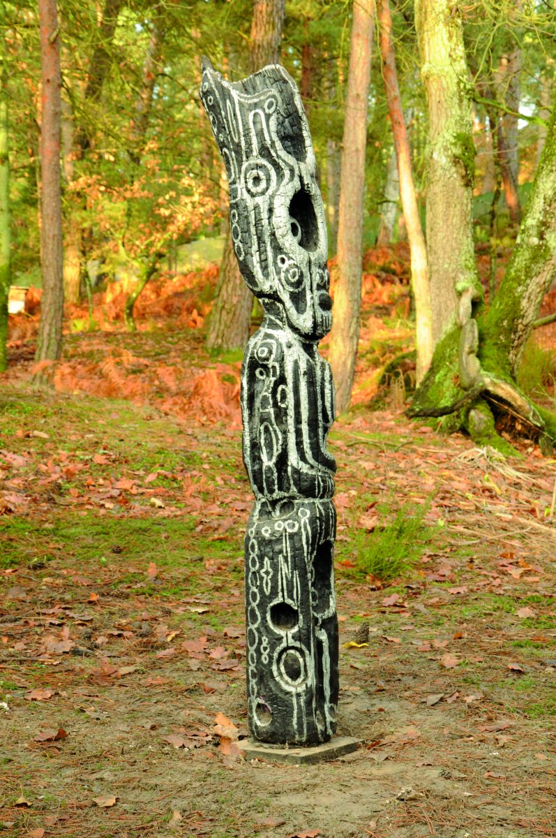 Sculpture en bois brûlé créé pour l'exposition en 1960 chez Camion, rue des Beaux-arts à Paris, peinte vers 1980.
