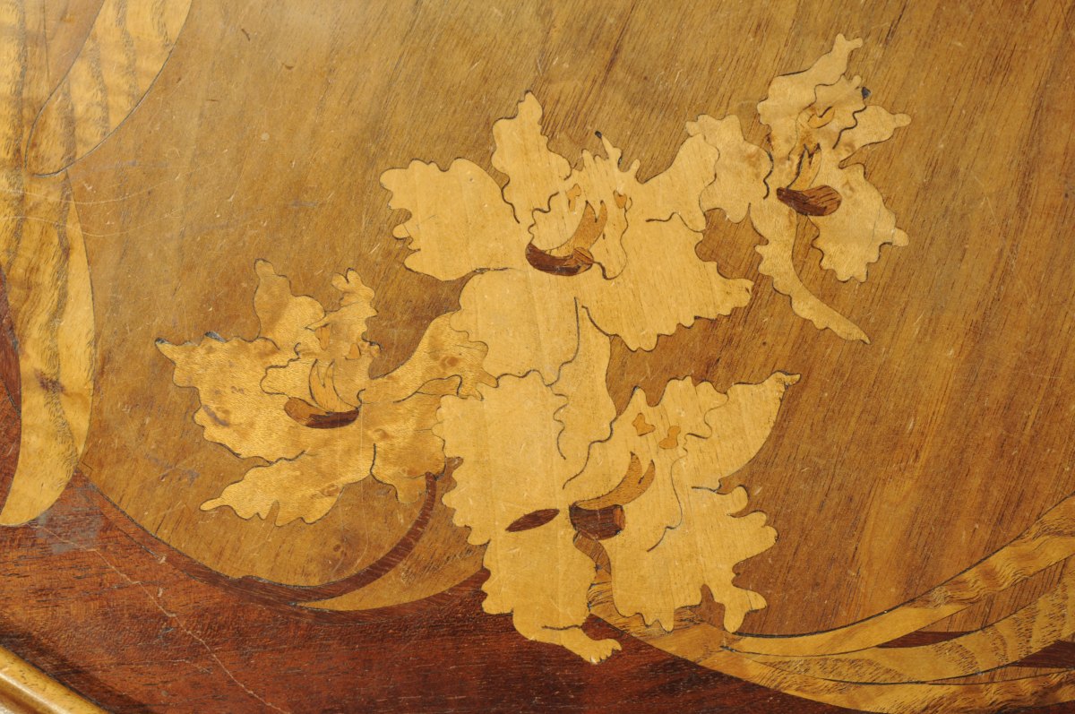 GUÉRIDON tripode en noyer mouluré, plateau en écusson à décor floral en marqueterie de bois précieux. Piètement cambré et ajouré réuni par une tablette d'entrejambe en écusson.