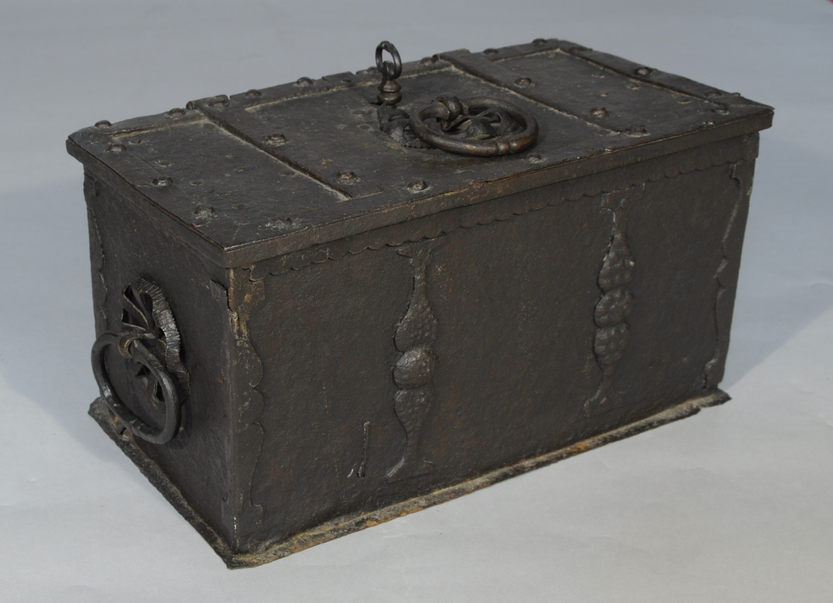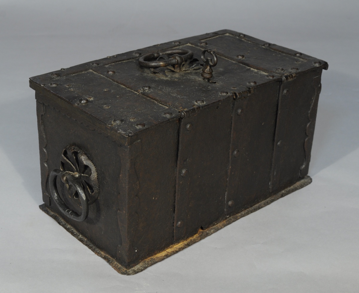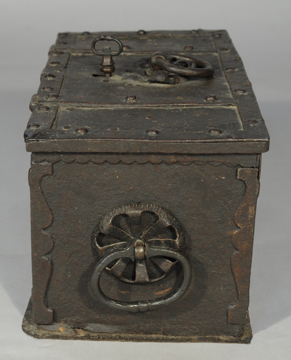 COFFRET de forme rectangulaire en fer. Poignées latérales et poignées supérieures mobiles agrémentées d'une rosace ajourée. Couvercle et face arrière lardés. Serrure sous le couvercle actionnant trois pênes. Mécanisme agrémenté de calottes en laiton ciselé. Recèle un petit coffre intérieur. Possède sa clef.