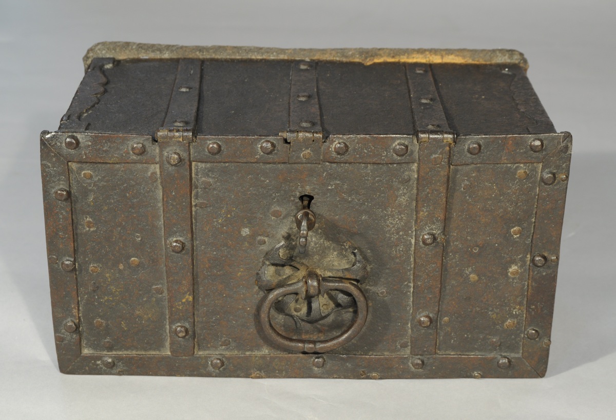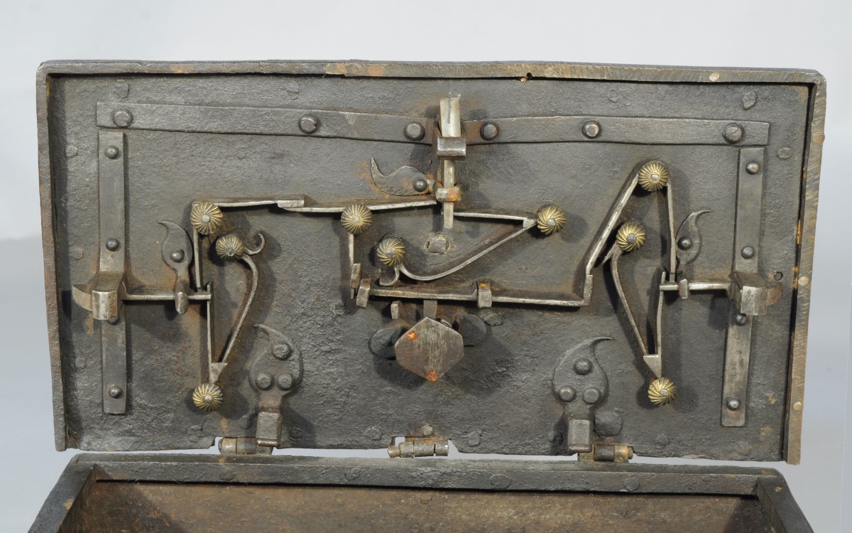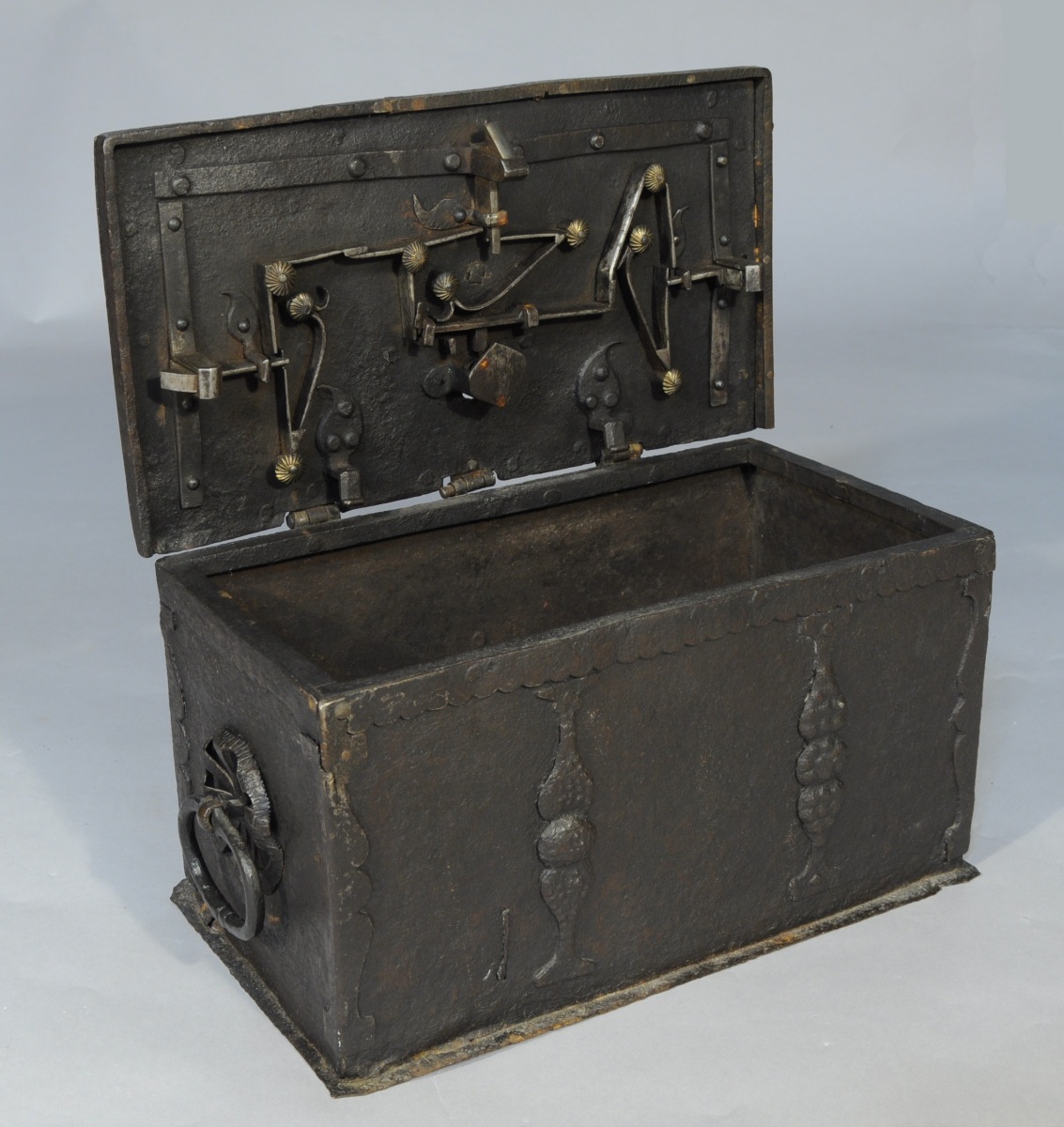 COFFRET de forme rectangulaire en fer. Poignées latérales et poignées supérieures mobiles agrémentées d'une rosace ajourée. Couvercle et face arrière lardés. Serrure sous le couvercle actionnant trois pênes. Mécanisme agrémenté de calottes en laiton ciselé. Recèle un petit coffre intérieur. Possède sa clef.