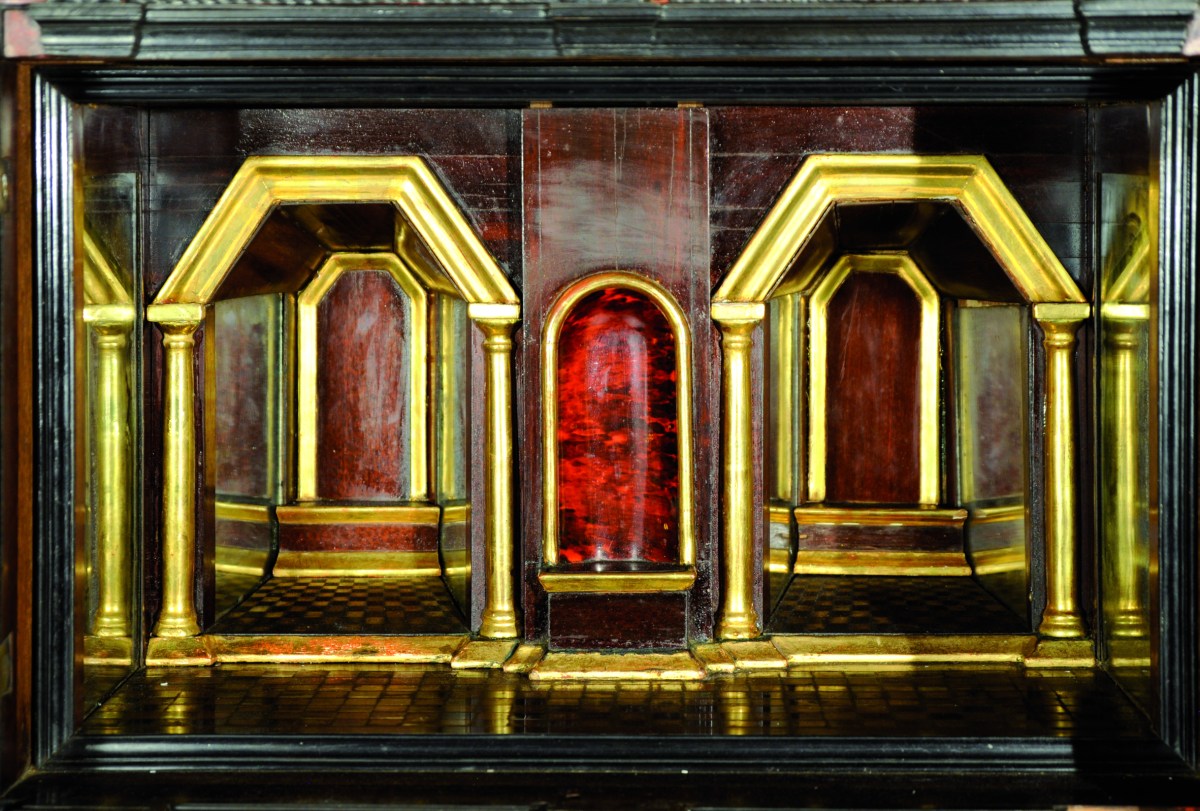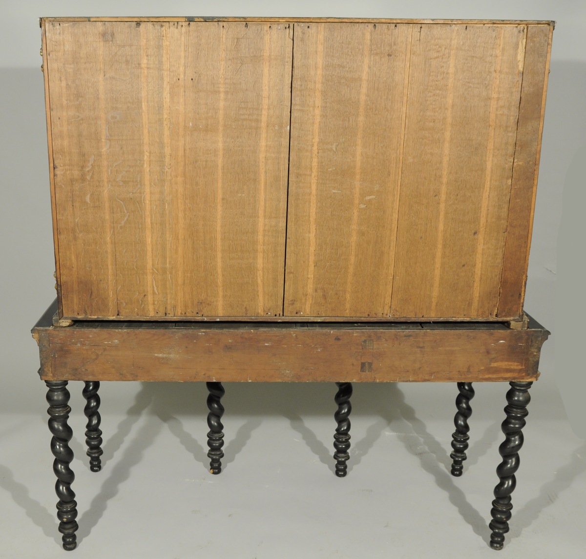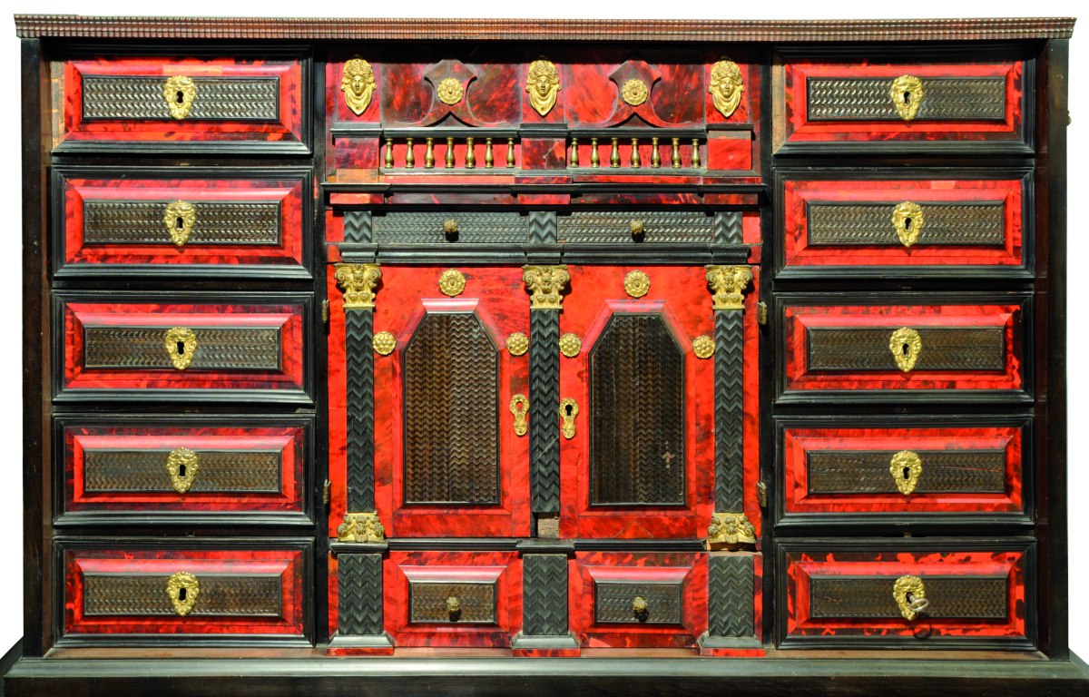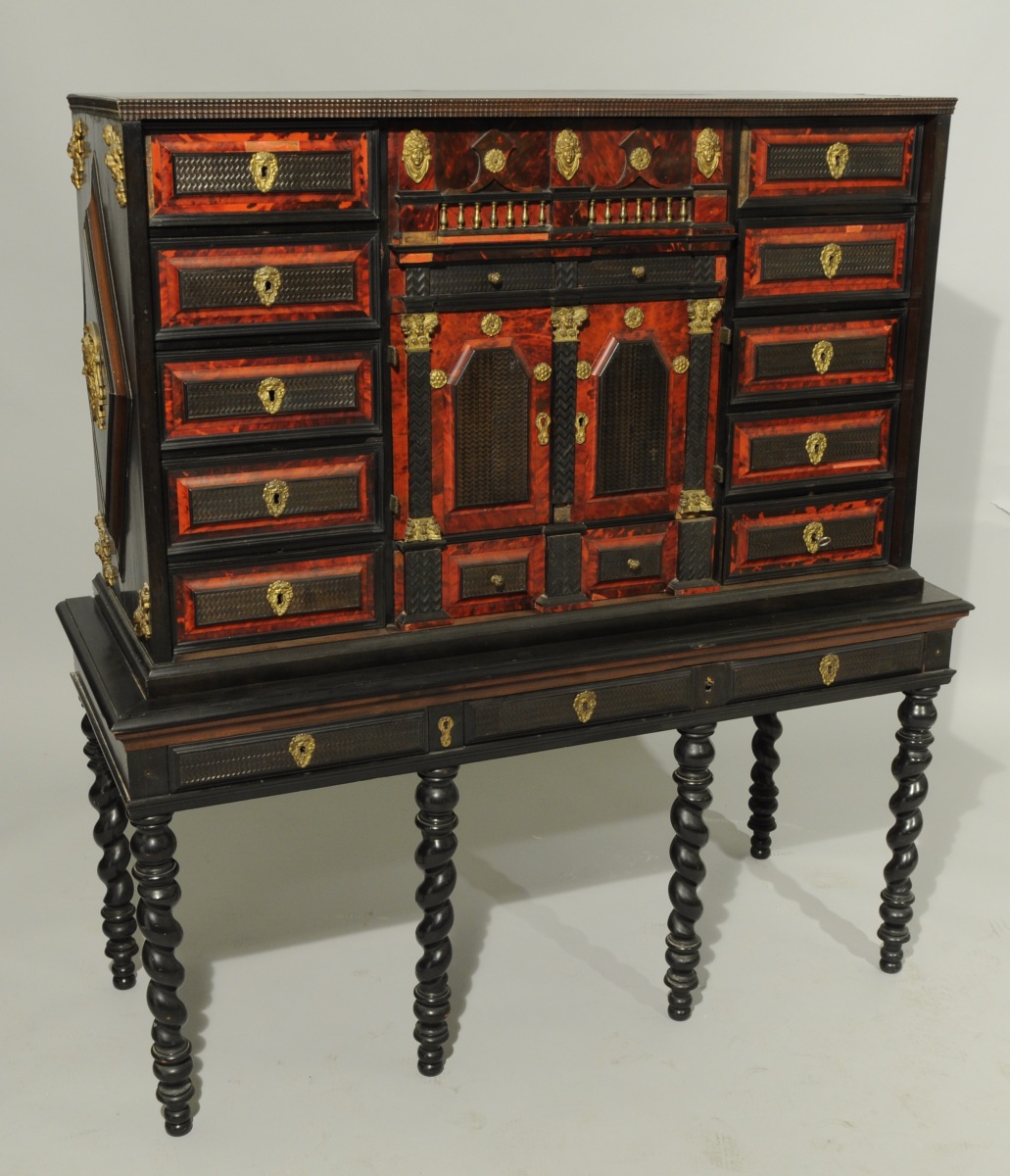CABINET rectangulaire en placage d'ébène mouluré, corne et écaille de tortue. Il ouvre à 12 tiroirs sur quatre rangs, deux vantaux et trois tiroirs en ceinture. Les tiroirs sont constitués d'un encadrement d'écaille centré d'un cartouche rectangulaire plaqué de corne thermoformée. La façade est composée de trois travées. Au centre, figure un portique constitué de deux pilastres corinthiens dont la base et le chapiteau sont en bronze doré. Les vantaux découvrent un théâtre agrémenté de deux niches foncées de miroirs, le sol en damier d'os et d'ébène. Sur les côtés, un motif losangé en léger relief. Garniture de bronze doré tel qu'entrées de serrure, poignées de tirage, mascarons, fleurs et guirlandes de roses.