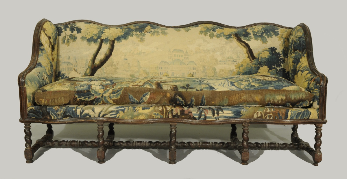 CANAPÉ quatre places à oreilles, en bois naturel mouluré, piétement torsadé recouvert de tapisseries d'Aubusson anciennes.