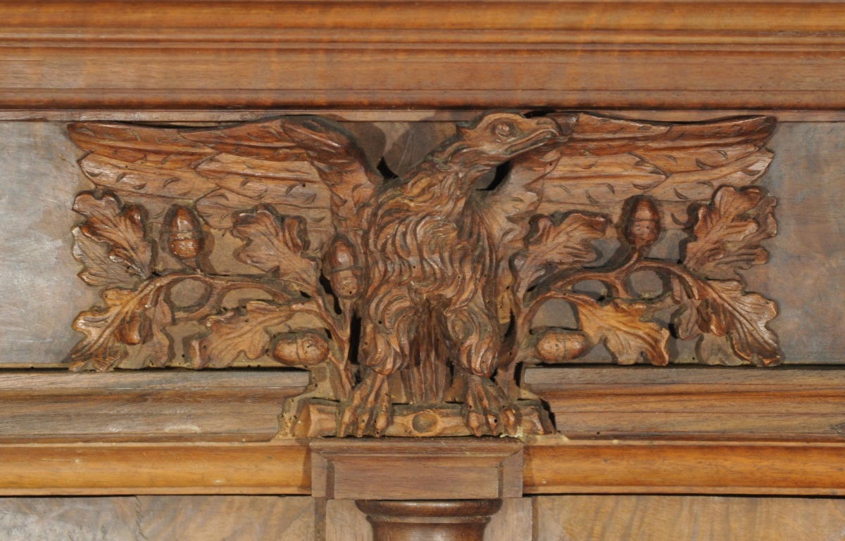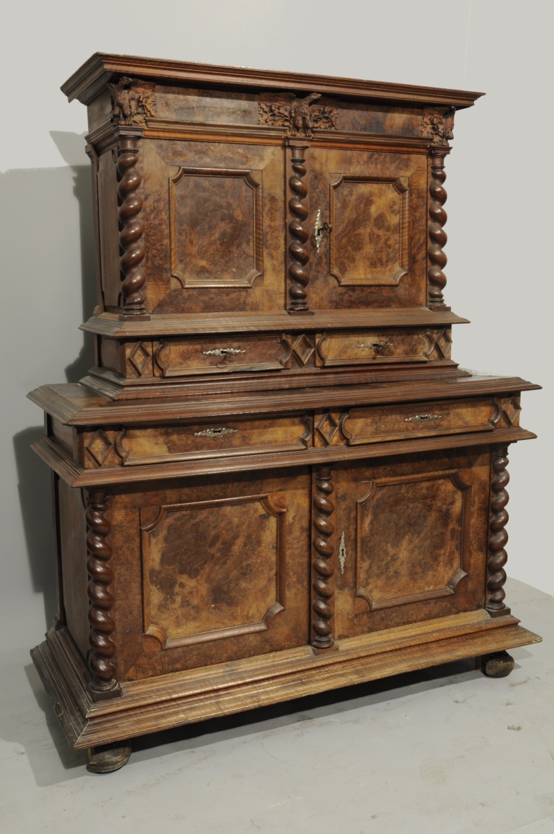 CABINET DEUX-CORPS en bois naturel et placage, dont loupe. Il ouvre, dans la partie supérieure en retrait, à deux portes et deux tiroirs, et, dans la partie inférieure, à deux portes et deux tiroirs. Montants à colonnes torses et trois motifs sculptés sous la corniche, d'aigles aux ailes déployées sur des branchages de chêne.