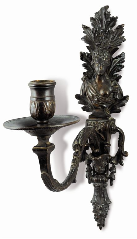 PAIRE D'APPLIQUES en bronze patiné, le corps surmonté d'un buste...